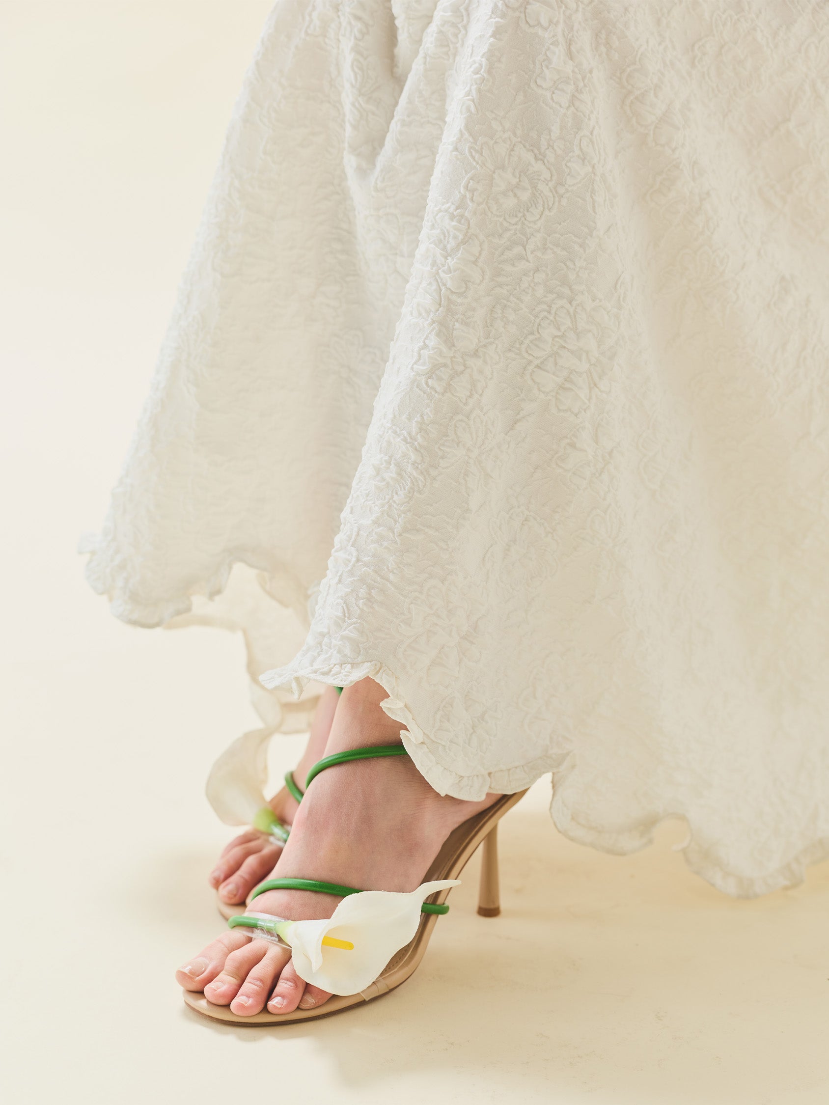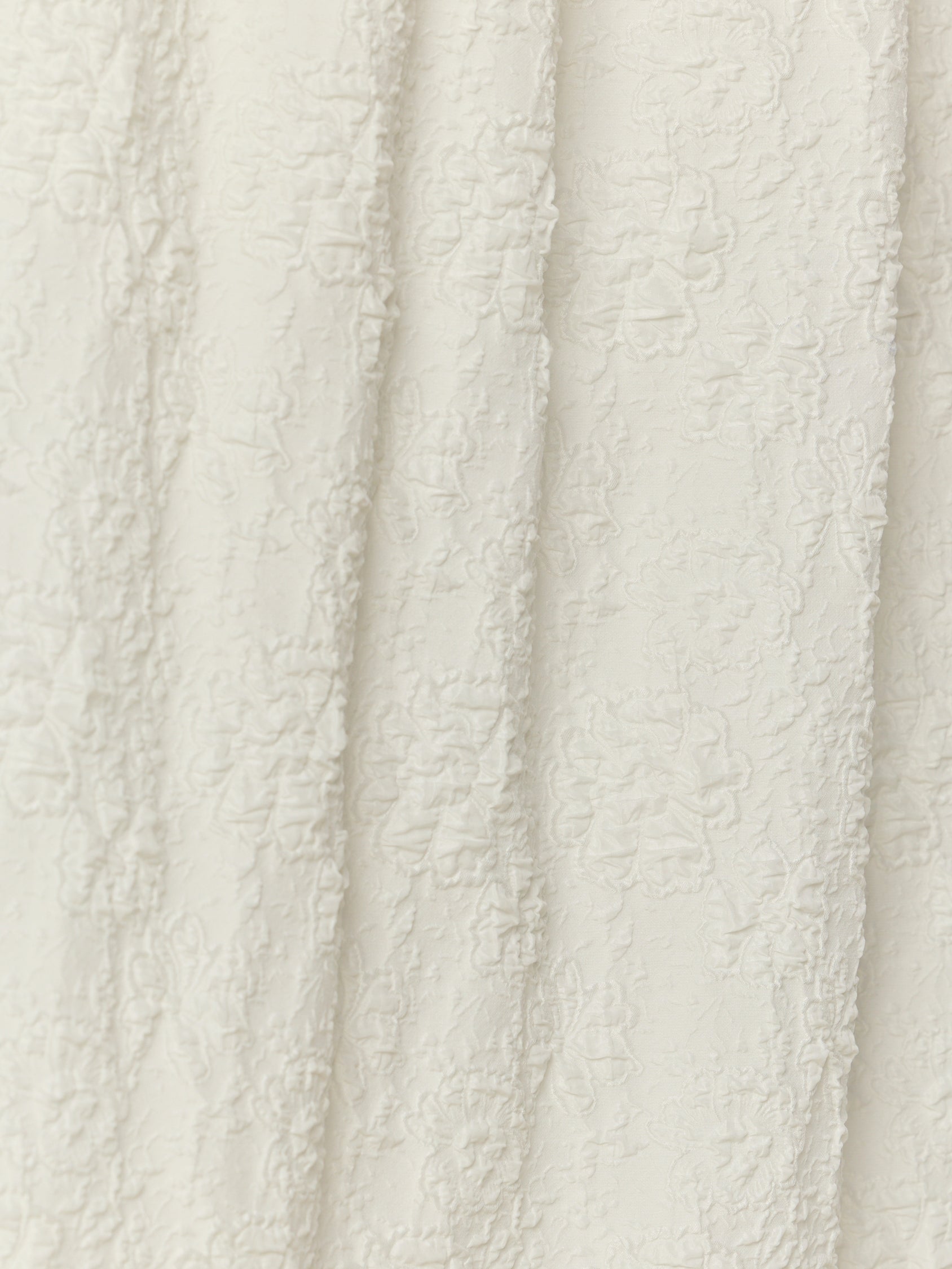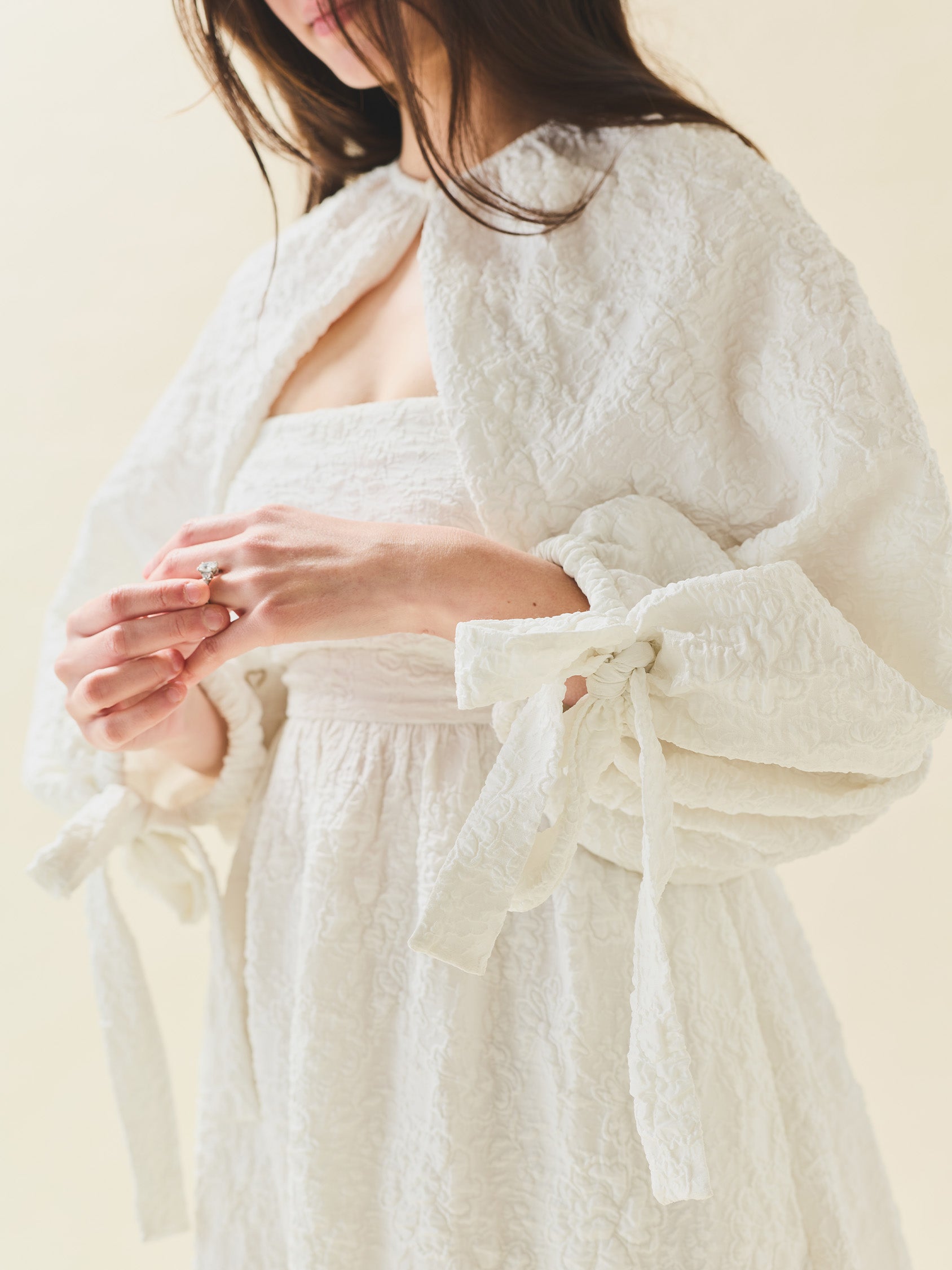 Crafted in a textured floral quilted fabric inspired by vintage Parisian textiles, it feels both heirloom and modern, light on the body, rich in detail. The silhouette is simple and timeless, letting the fabric do the talking while the lace-up back adds a quiet, romantic finish.