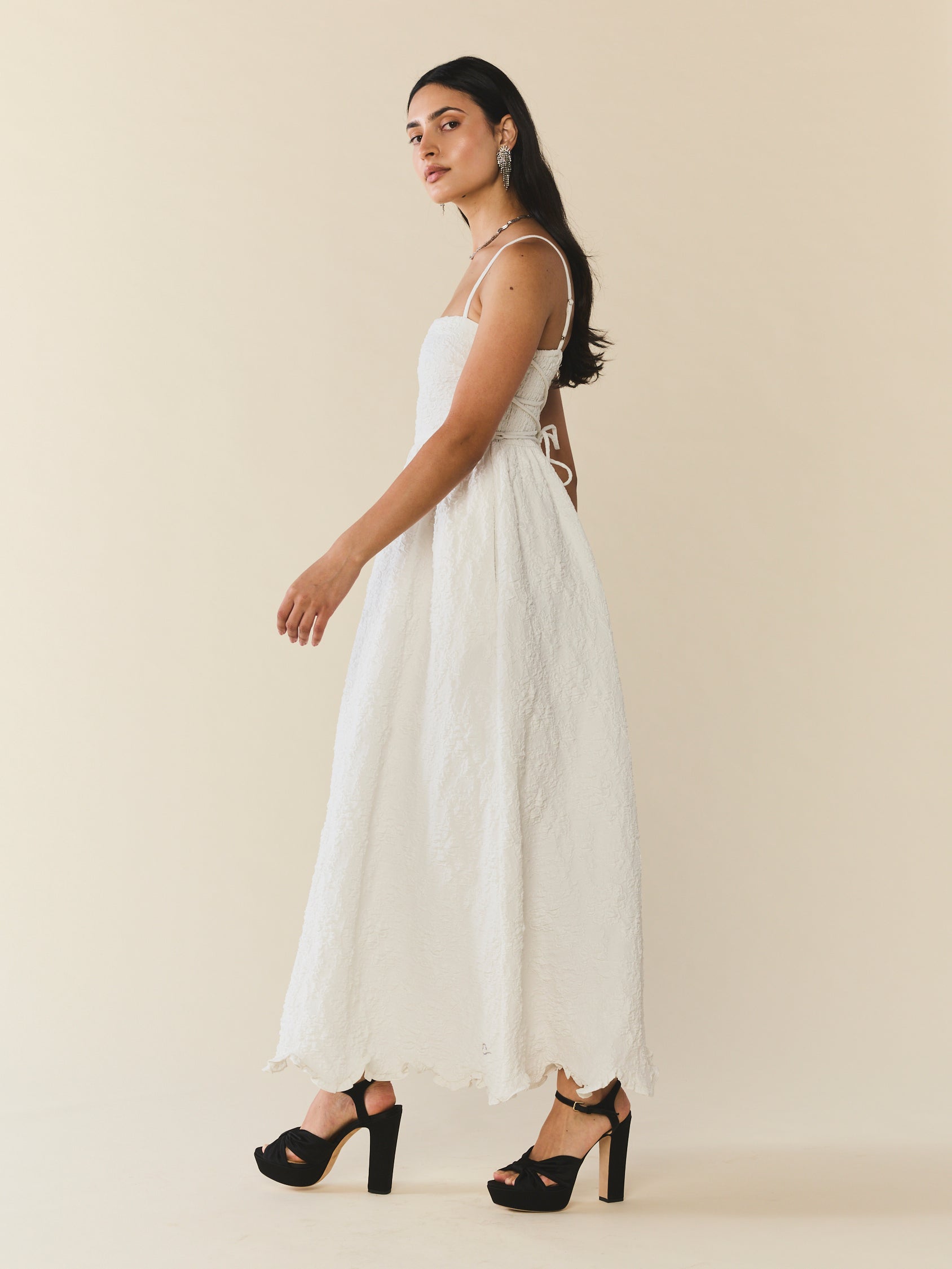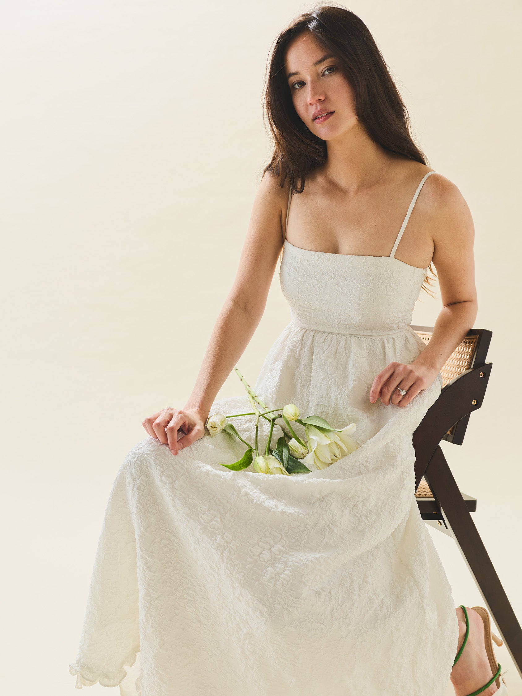 A romantic, effortless silhouette designed to move with you, from ceremony to celebration. This airy midi features delicate adjustable straps, a softly structured bodice, and a lace-up back for a customizable, close-to-you fit. The gently gathered skirt creates an easy sense of movement, whether you’re walking down the aisle, heading to dinner, signing papers at the courthouse, or dancing late into the night.