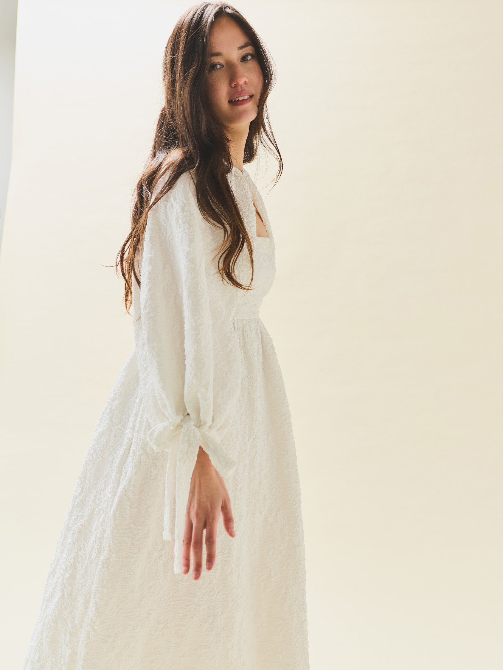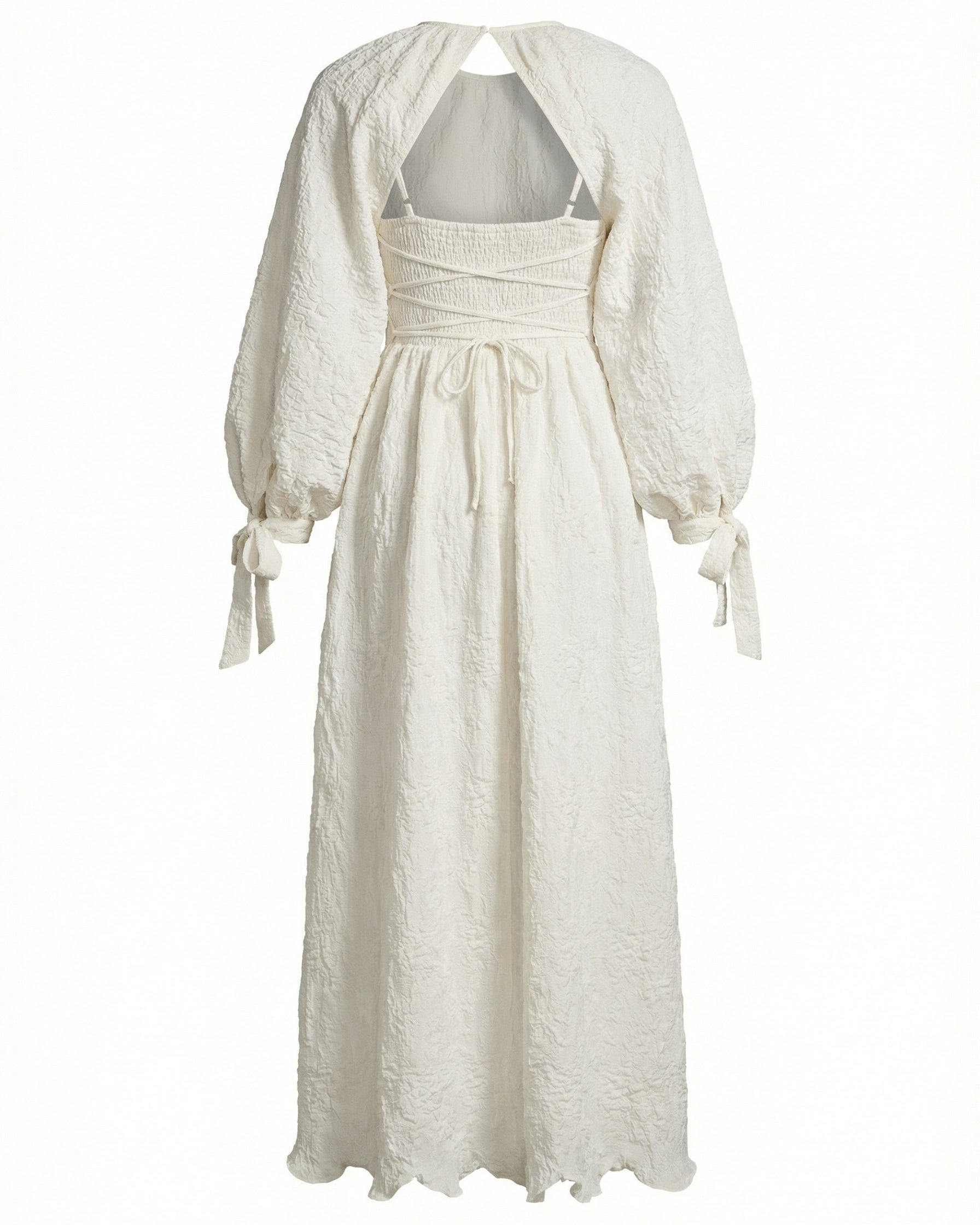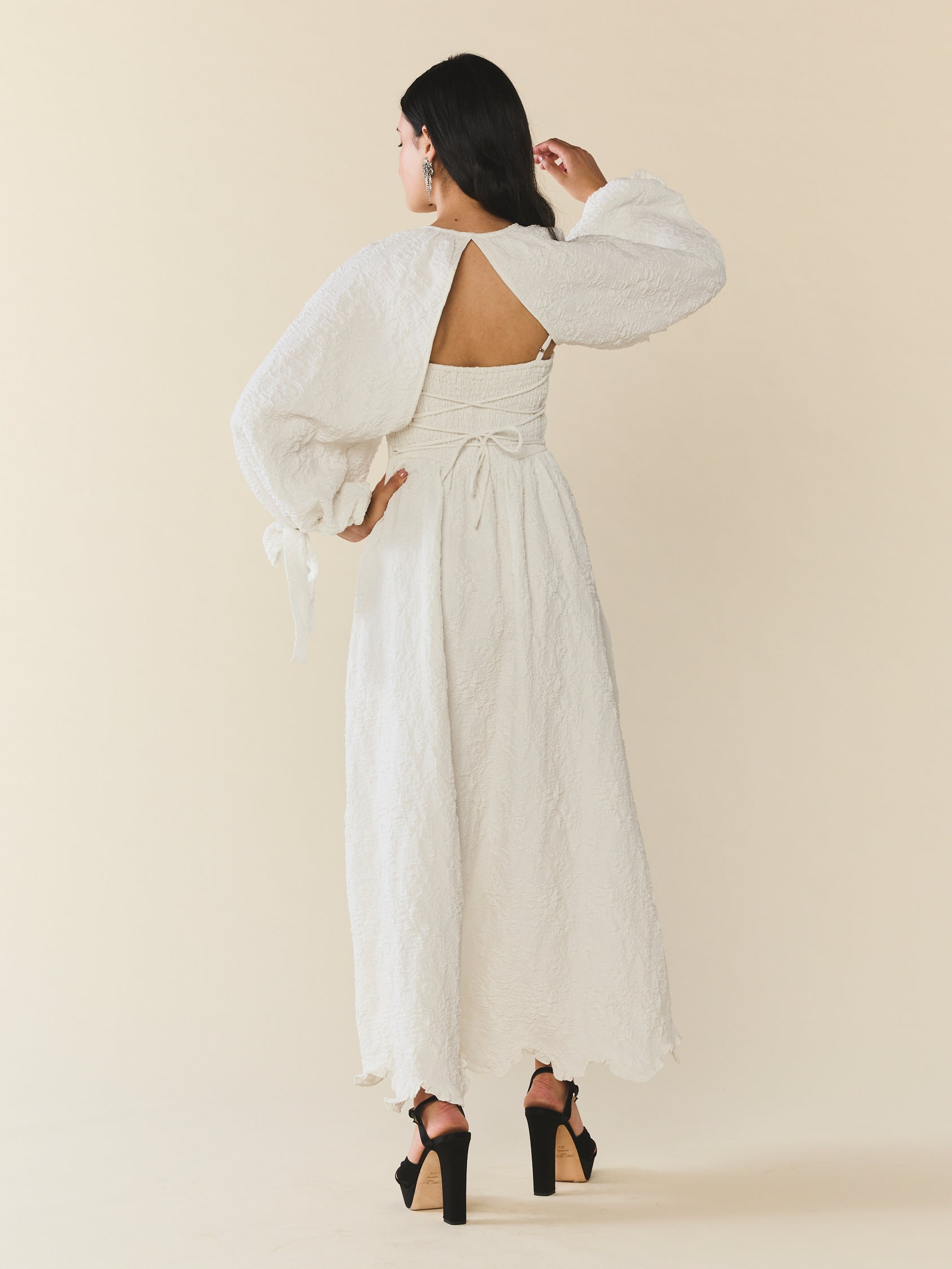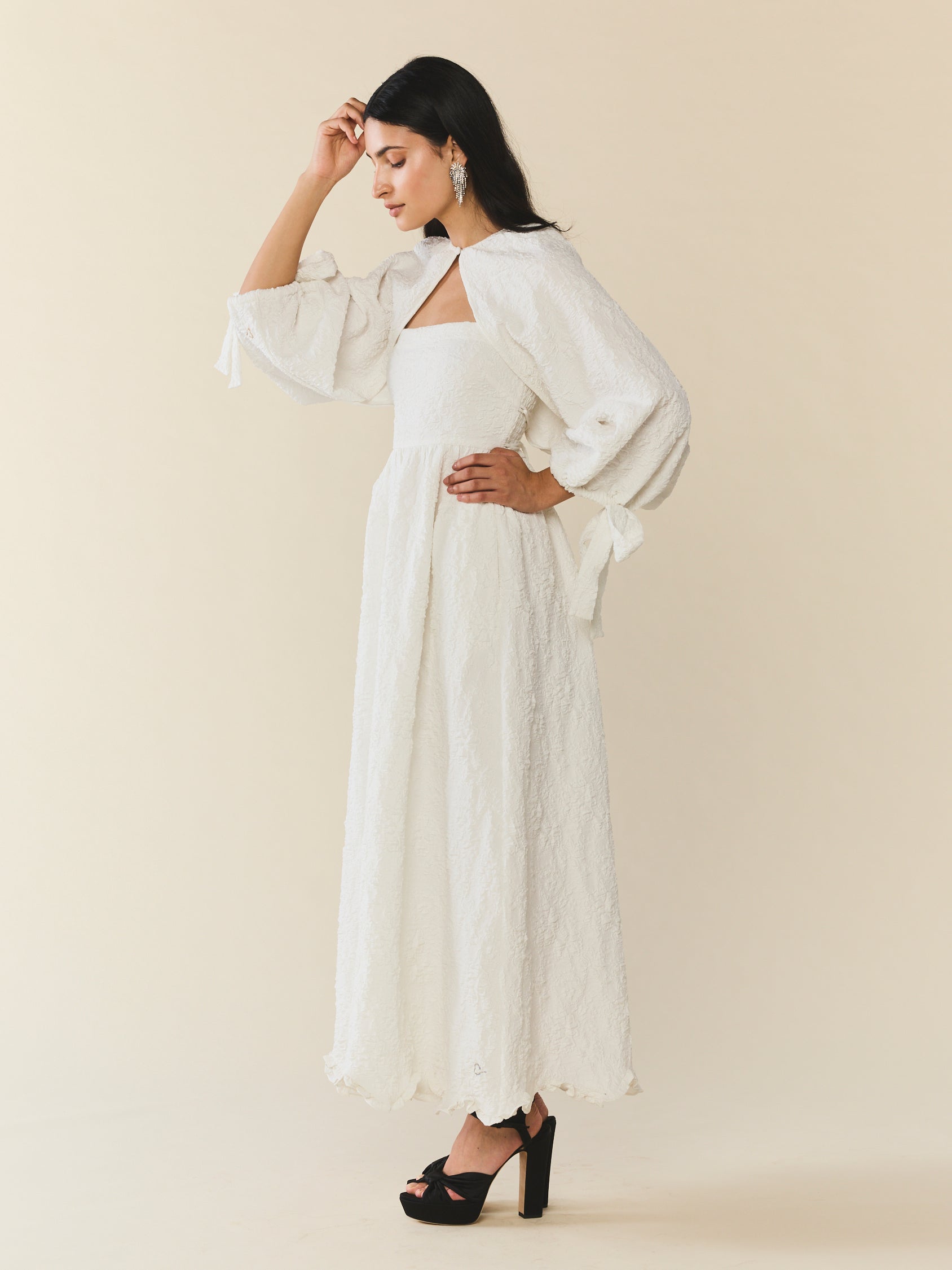 An effortless layer made for movement, softness, and ceremony-adjacent moments. This airy bridal cape features voluminous balloon sleeves with delicate tie cuffs and a romantic button closure. Designed to drape lightly over your shoulders, it adds quiet drama without overwhelming the look.