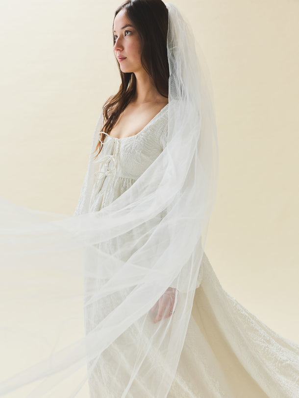 A sweeping, romantic layer designed to feel as special as the moment itself. The Sweet Pea Cape features a soft square neckline with delicate tie detailing, voluminous long sleeves, and an airy silhouette finished with a soft train. Designed to slip effortlessly over your look, it adds instant softness and drama.