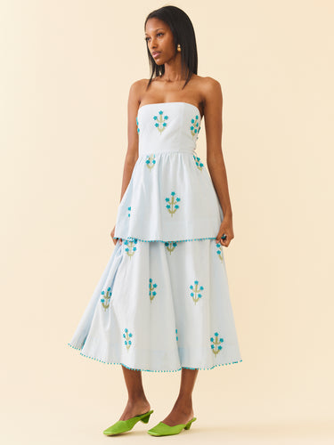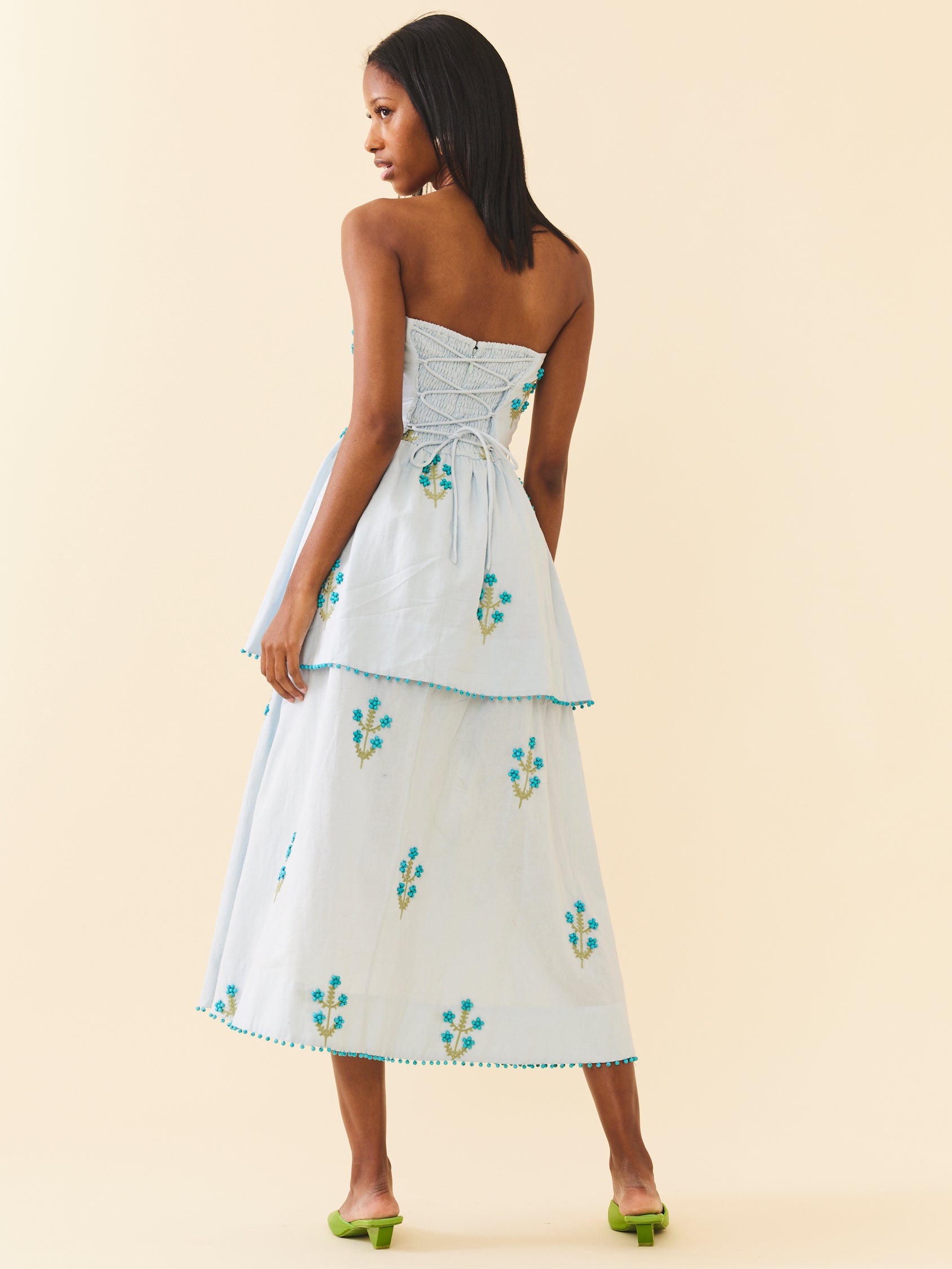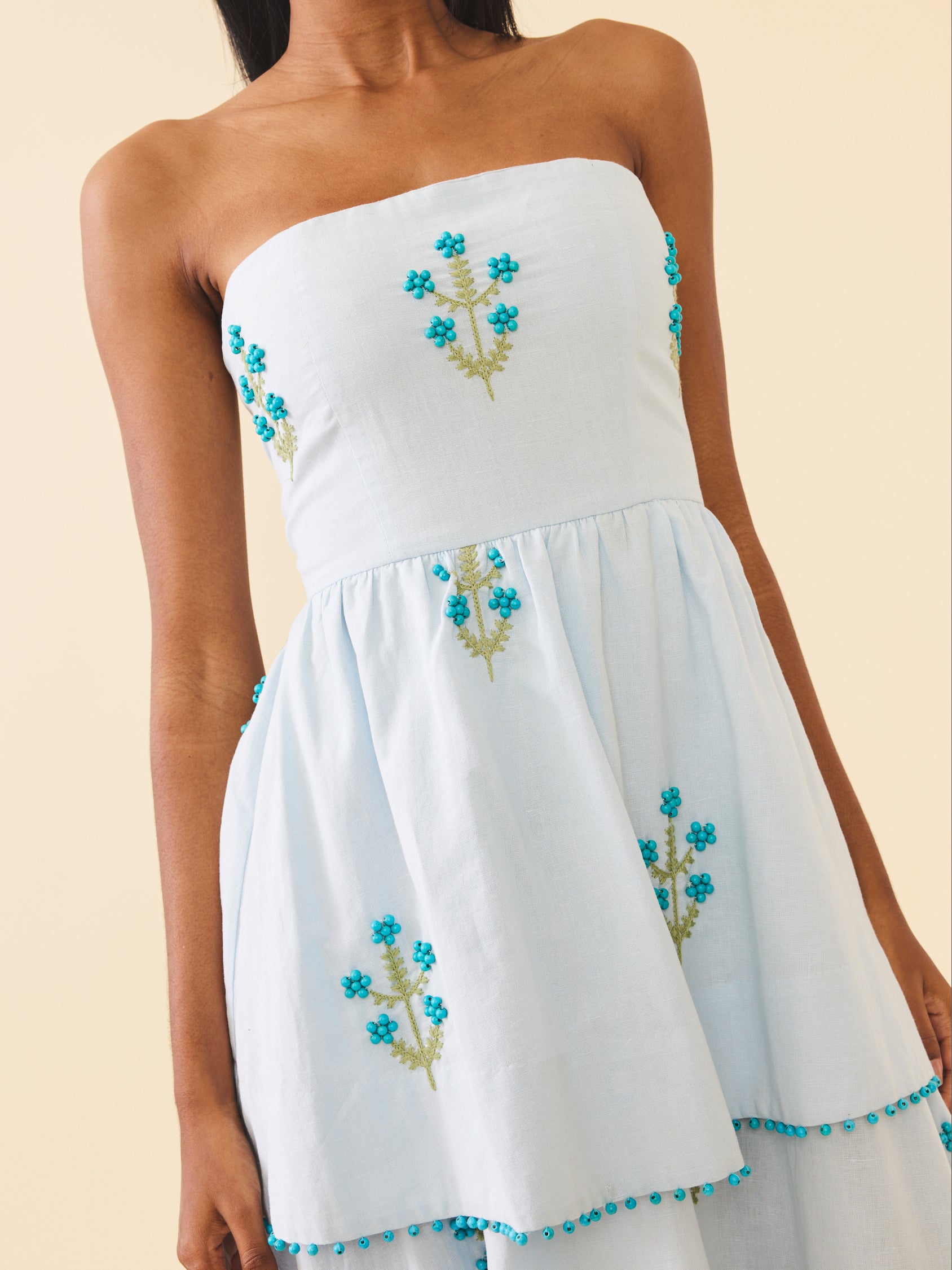 Its' strapless silhouette, enhanced by a smocked back, zipper closure, and belted waist ensures a flattering fit that moves with you. As you make your entrance, the allover flower motif crafted with intricate beadwork and embroidery adds a touch of whimsy.
