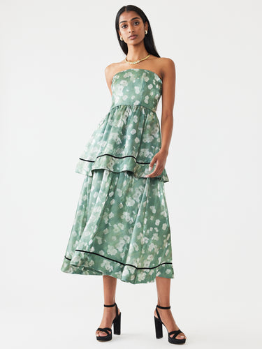 Its' strapless silhouette, enhanced by a smocked back and zipper closure, ensures a flattering fit that moves with you. As you make your entrance, the velvet lined hem adds a touch of whimsy.