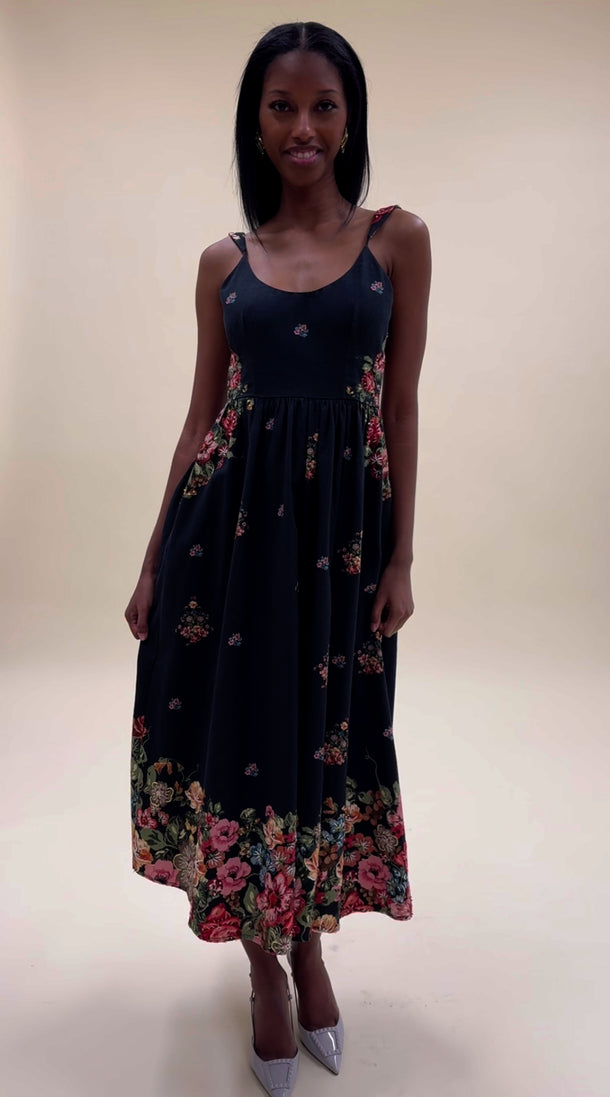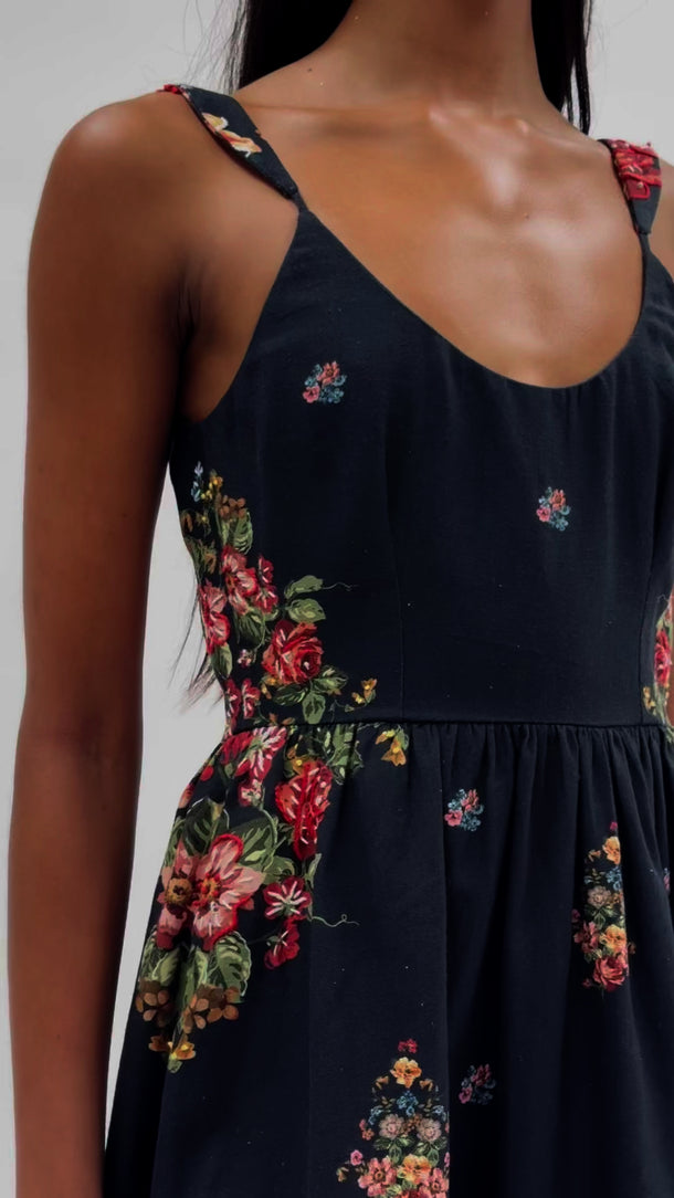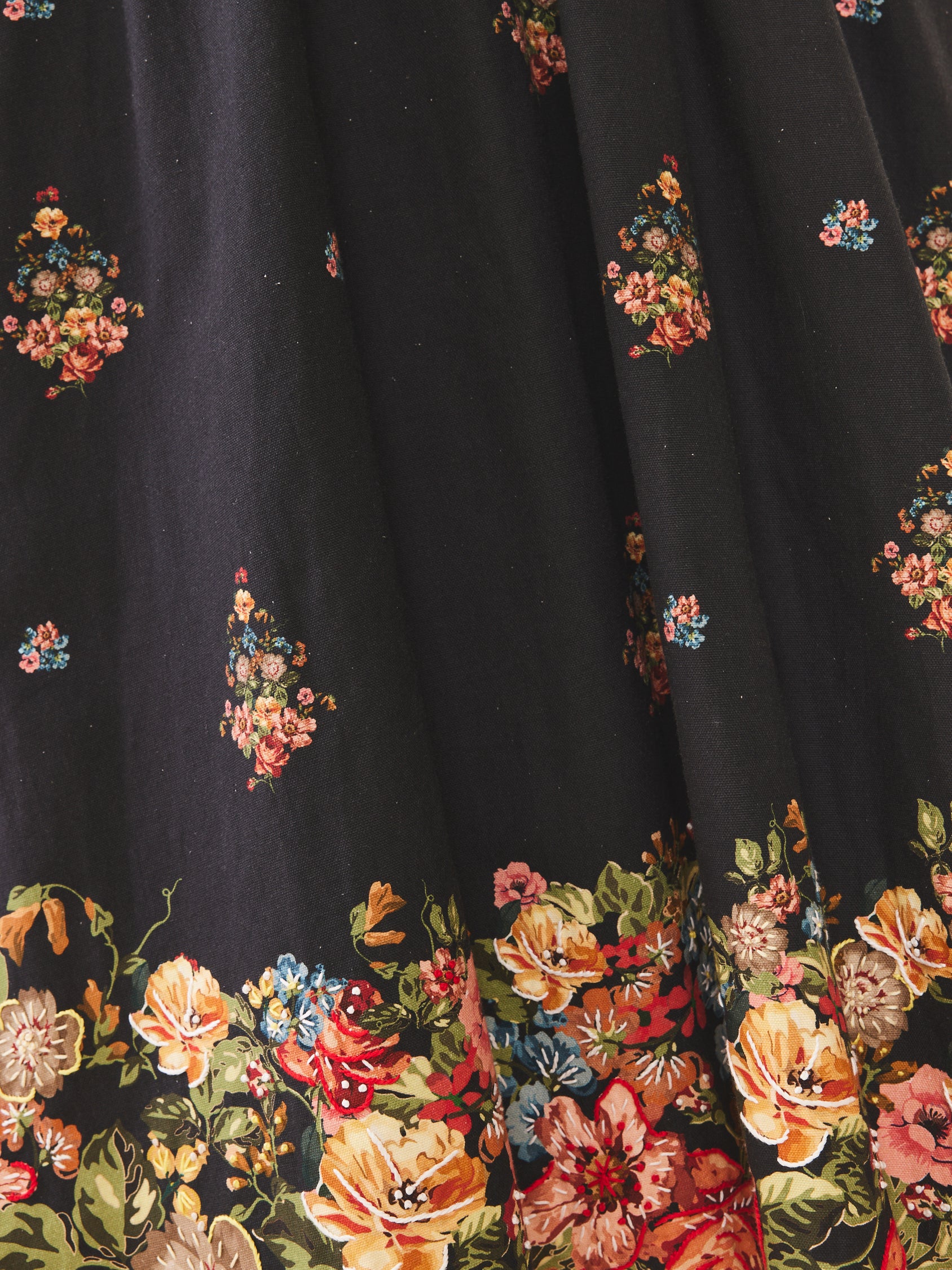 Introducing Katherine, a midi-length dress adorned in a bold Victorian floral print with hand embroidery over top. Bringing the drama, this dress is finished with a voluminous a-line skirt.