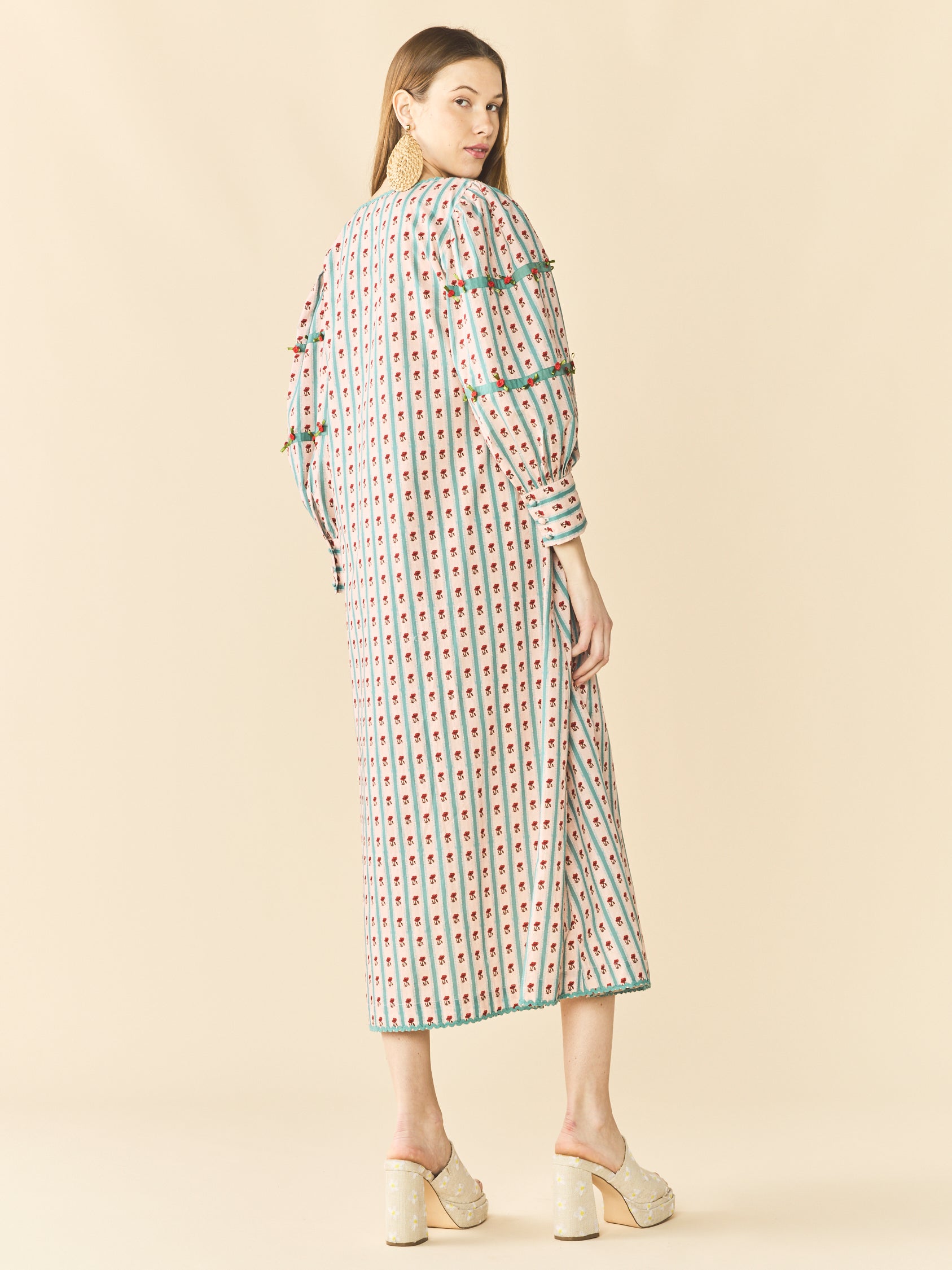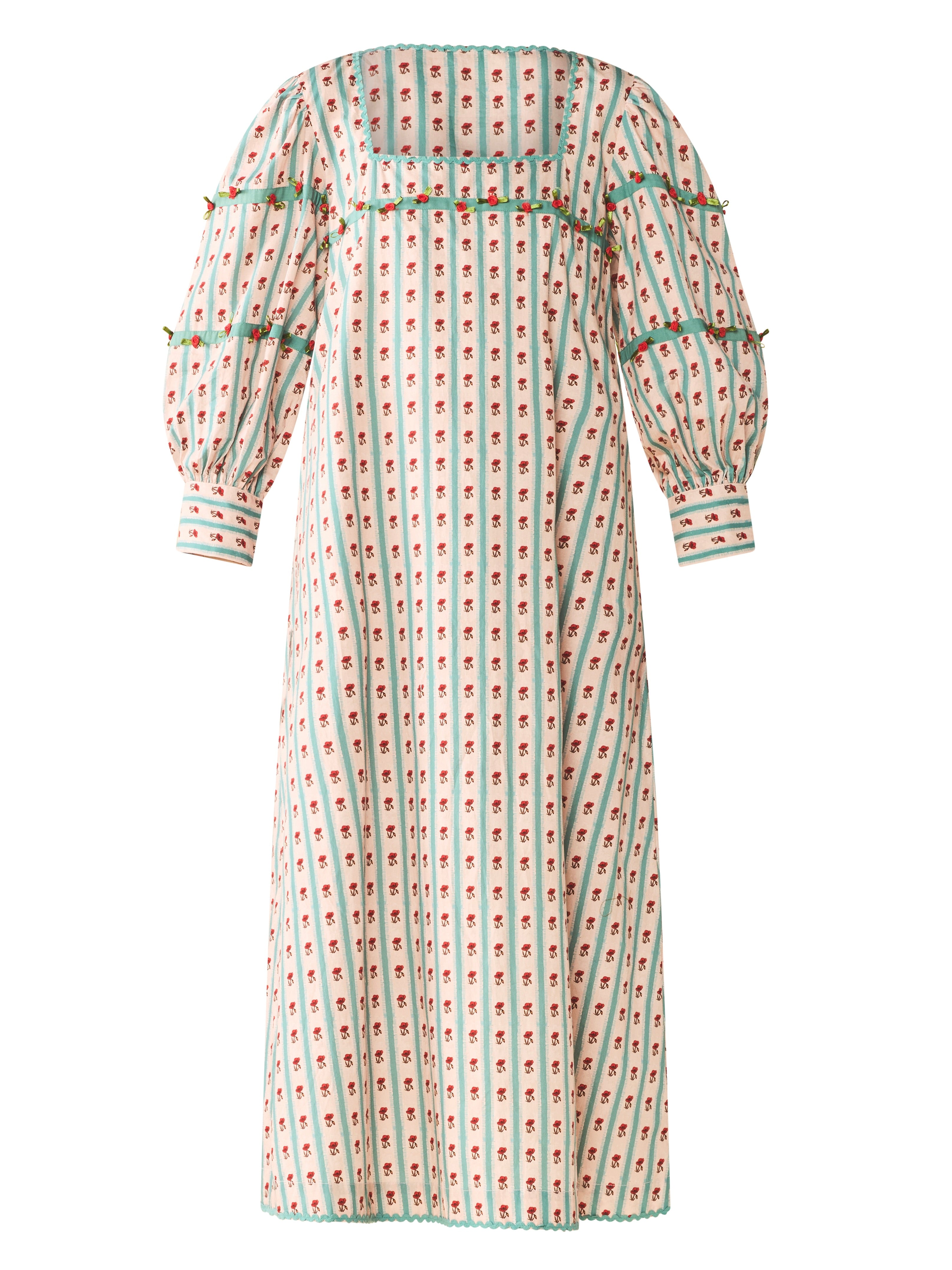 Dainty but never dull. Tara is your easygoing caftan with a straight fit and full-length drama. She’s decked out in all over floral print, softened with mini rose detailing, ribbon accents, and a sweet pleated cuff. Square neckline, fully lined, and ready for everything from garden parties to grocery runs. Coverage? Full. Vibe? All in bloom.