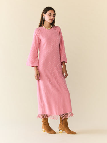 Introducing Ariana. Crafted in a pink jacquard, this dress is meant for a party. Fringe lined hem ready for the dance floor. Relaxed fit to ensure comfort all wear long. Bracelet length flared sleeves and a simple keyhole in the back, finished with a single button. Final touch of subtle floral print throughout.