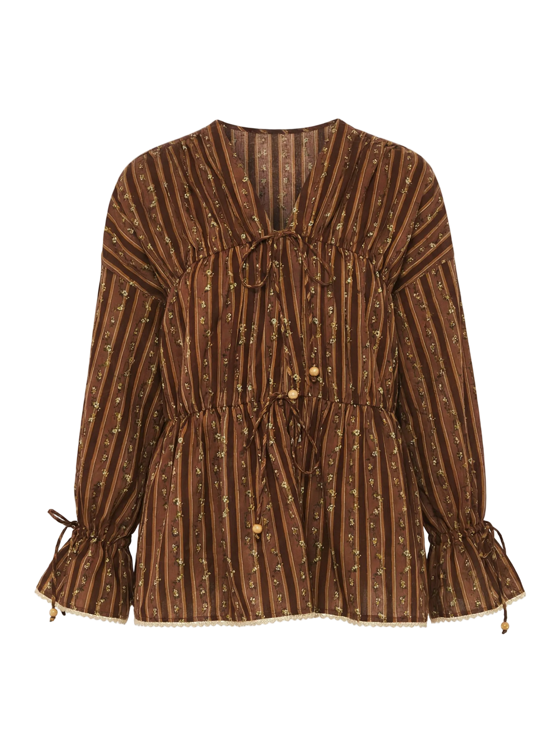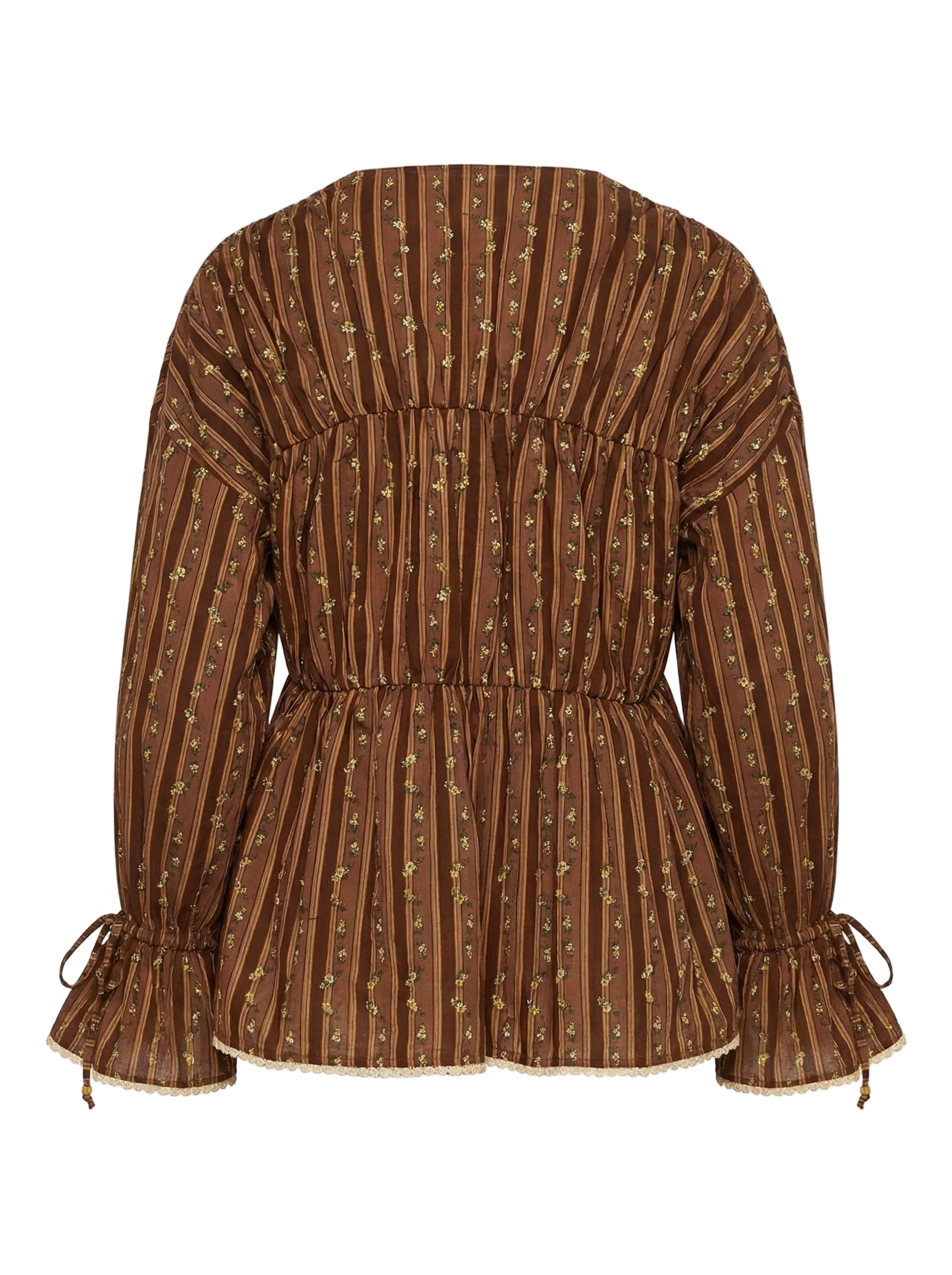 The Isle Top floats in airy cotton with a gathered silhouette that drapes just right. Delicate cream ric-rac trim the cuffs and hems, while a dainty floral print whispers romance all over. This easy silhouette showcases a stunning collaboration with artist Larsen McDowell, featuring vibrant floral artwork set against classic chocolate stripes. Light, easy, and endlessly wearable, she’s made for slow mornings, soft breezes, and everything in between.
