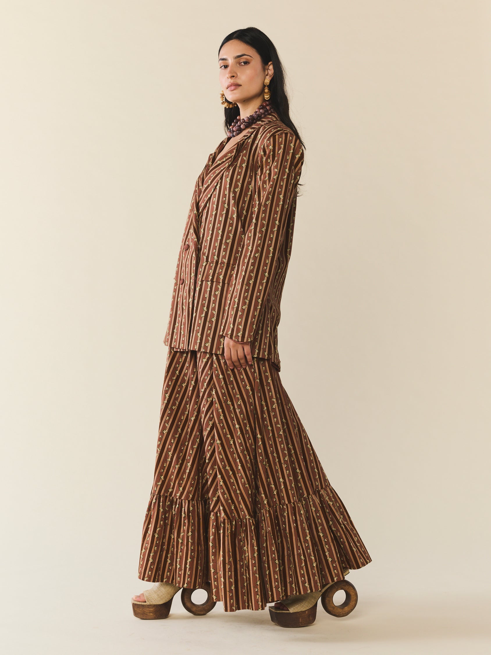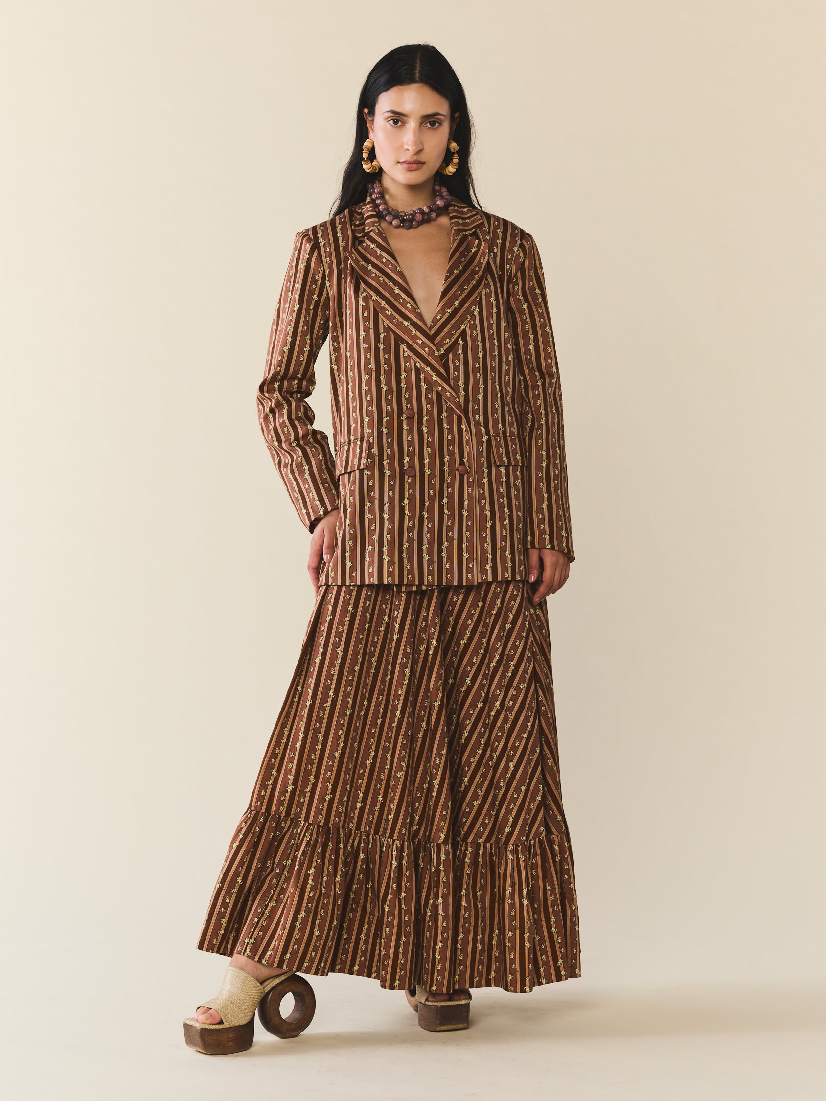 Meet Sloan. A double breasted blazer inspired by that one you stole from your ex. Lightly accented shoulder pads, a boxy, hyper-relaxed fit. The perfect finish to a chic suit moment or thrown over a party dress. The blazer showcases a stunning collaboration with artist Larsen McDowell, featuring vibrant floral artwork set against classic chocolate stripes.