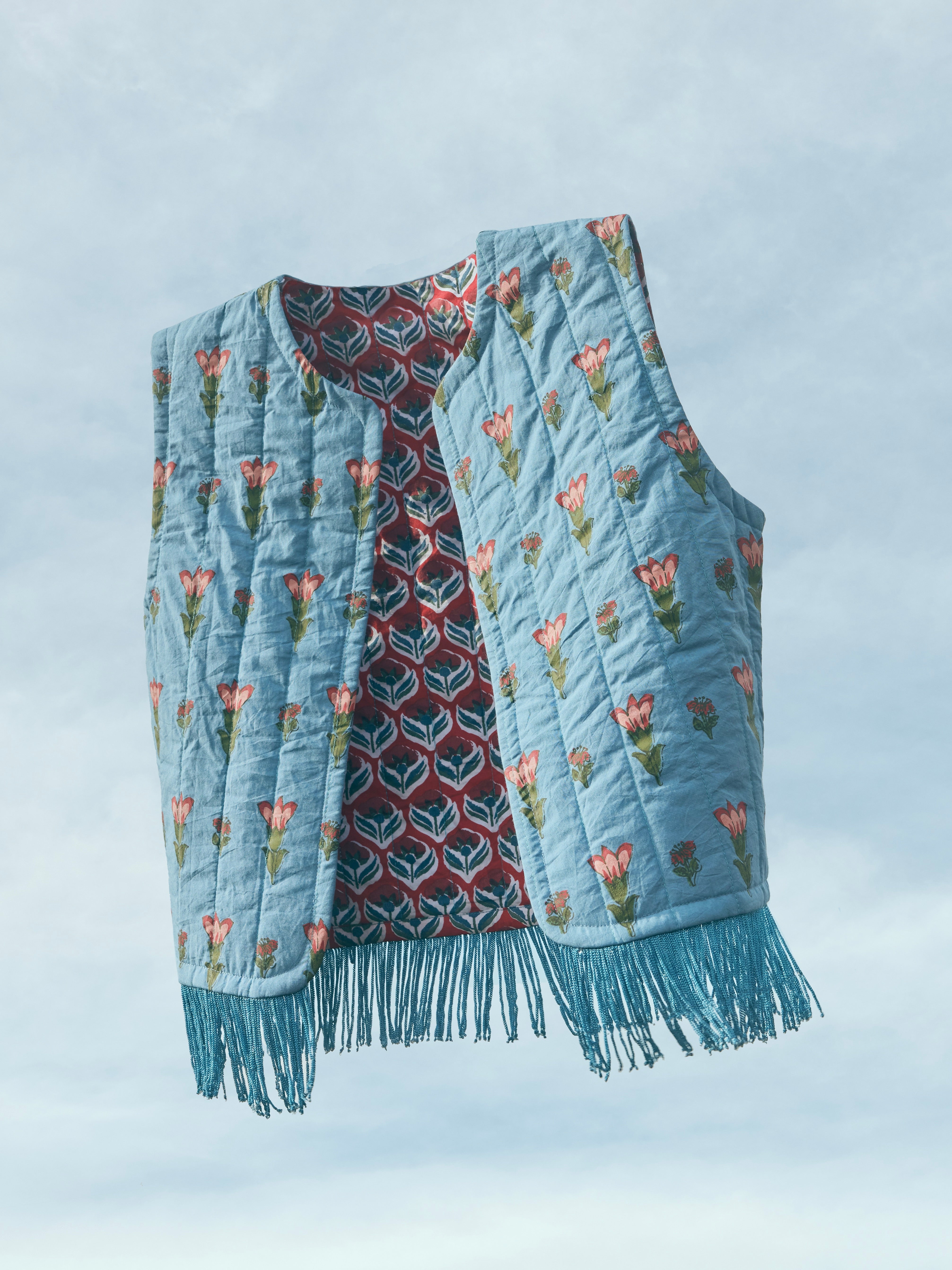 With a flourish of western inspiration, this reversible vest is made of our special prints so each side is a statement. This slightly cropped length style has a boxy silhouette, with fringe that dances along the hemline, and binding edge finishes