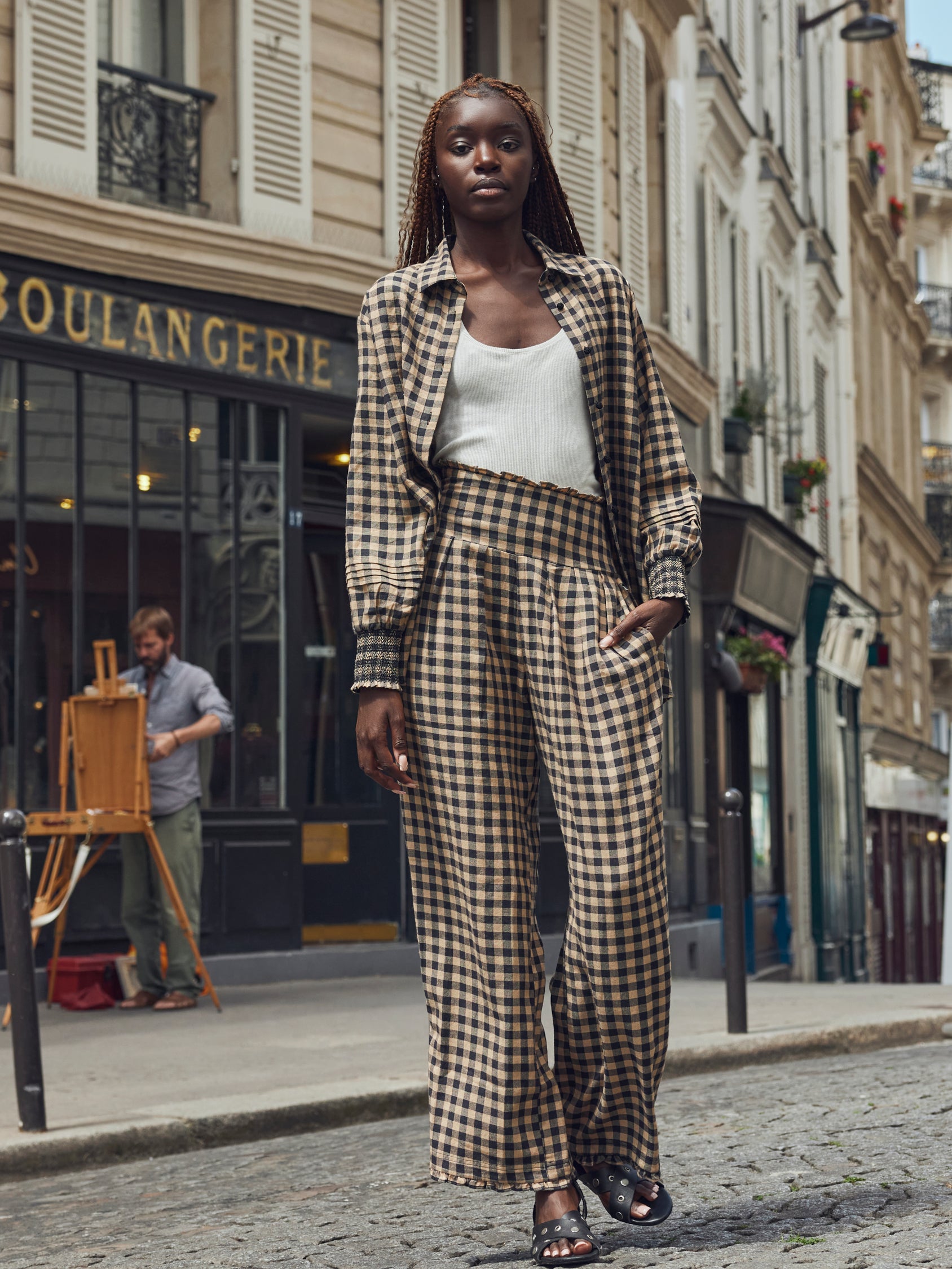 Introducing the Kirby pants - a blend of refinement and comfort, drawing inspiration from the iconic silhouettes of the 1940s. Adorned with black and tan checkered print. Delicate ruffle detailing the seams. Designed with comfort in mind, the waistband features elasticized elements and a size invisible zipper ensuring ease of movement. Wear with the Big Ole Buttondown for a full moment or pair with a simple tee for a casual look.