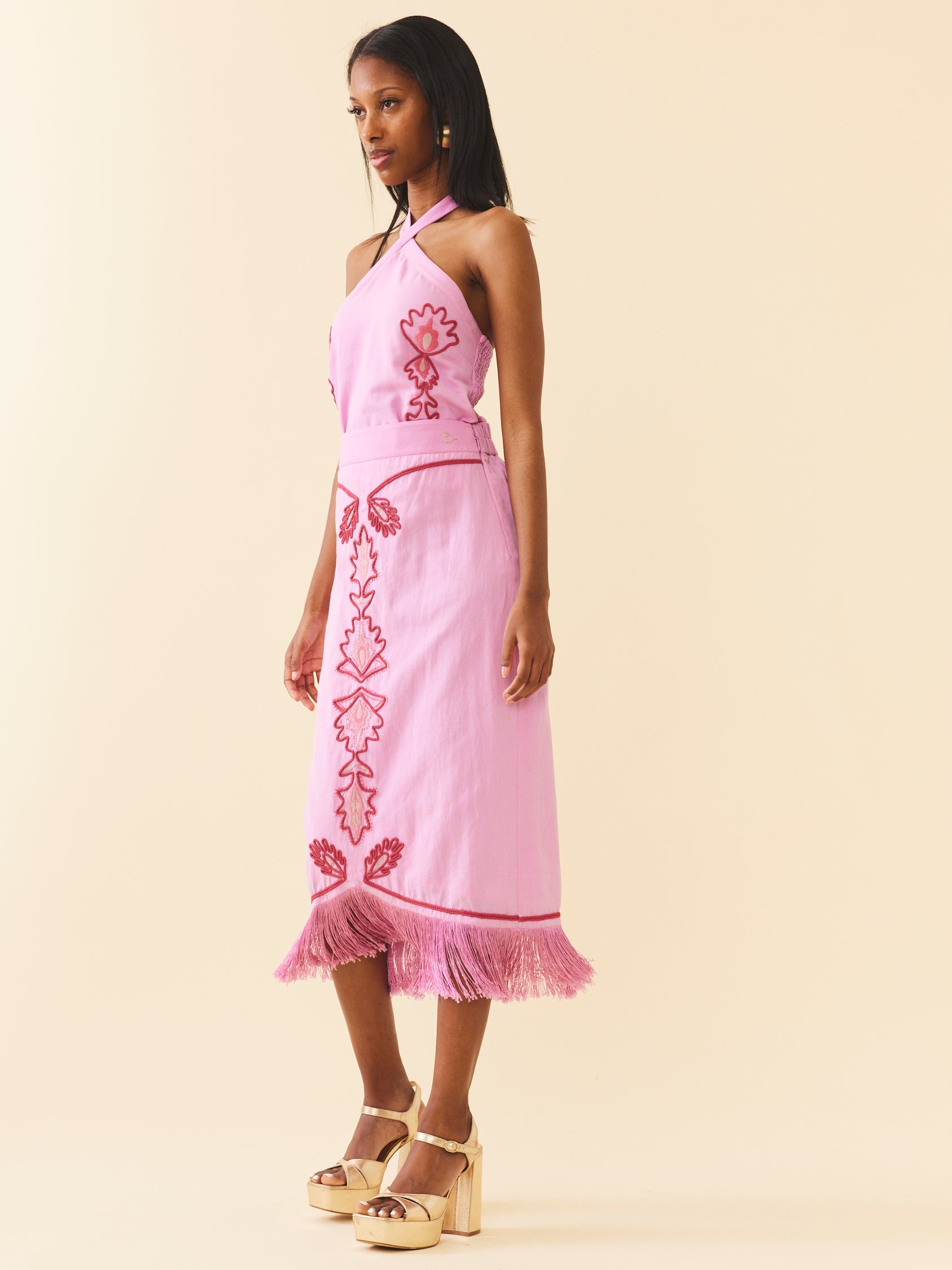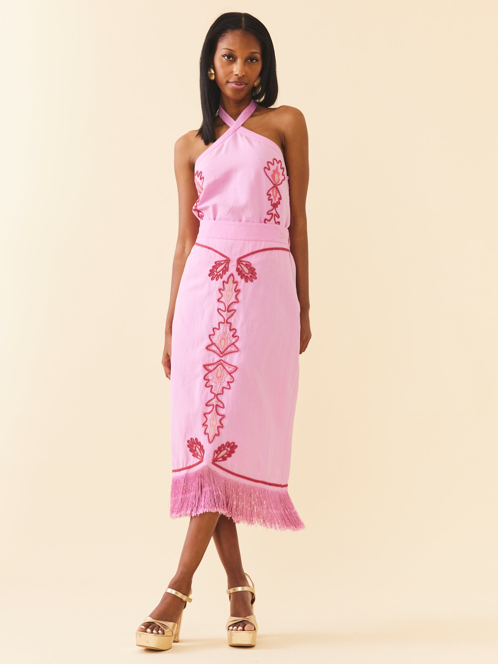 The Lucia top is a halter-tie style with an open back, made from pink cotton-linen and detailed with violet-toned rope embroidery. Its relaxed fit and effortless vibe make it perfect for sun-drenched days, impromptu plans, and all the good energy in between.