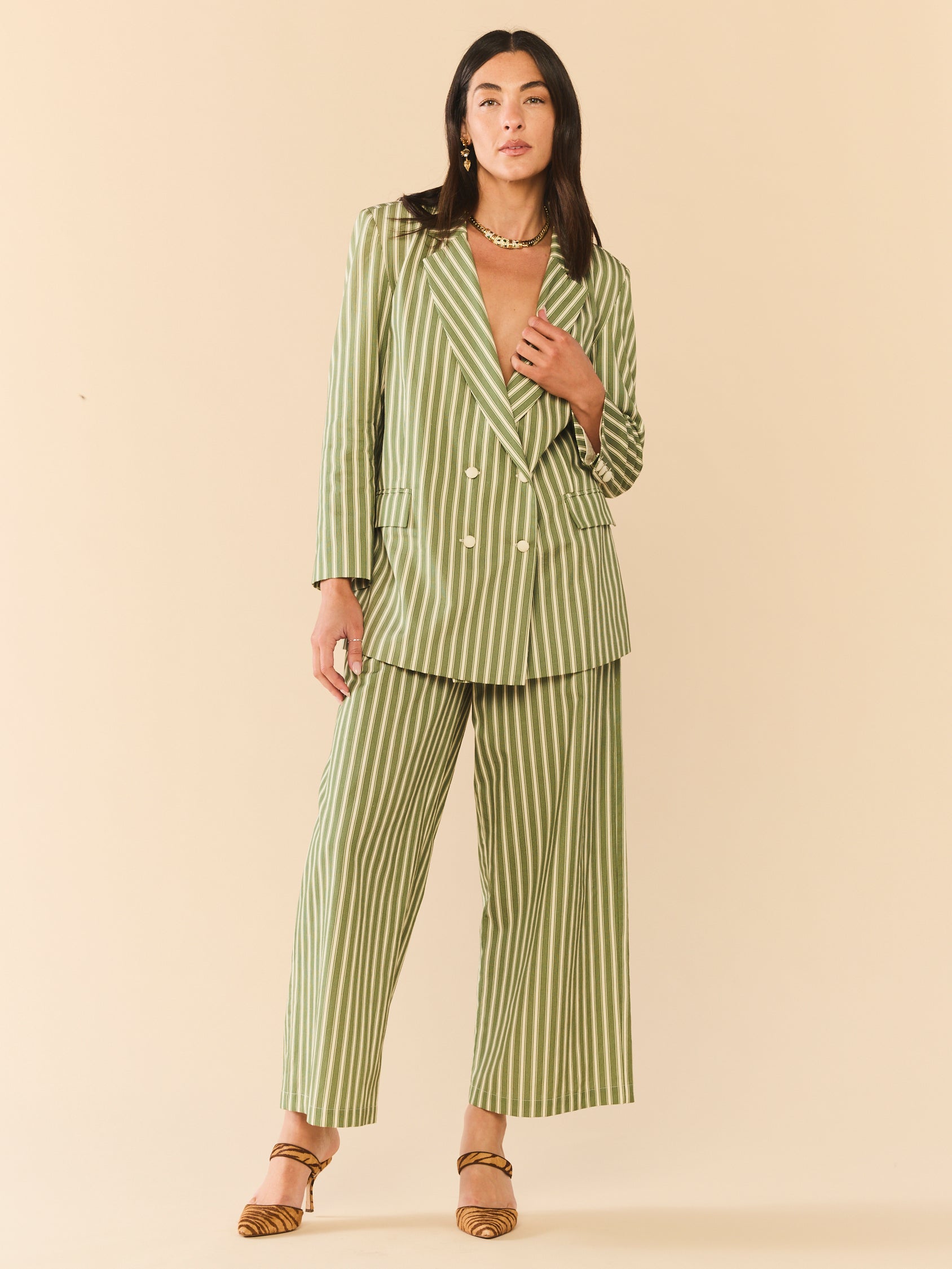 A double-breasted blazer, but make it modern. Tailored with ease in soft green and white stripes, Meredith is your shortcut to looking pulled together without trying too hard. Oversized enough to throw on over a tee, yet structured enough to carry you into a dinner meeting, this one’s all about balance.