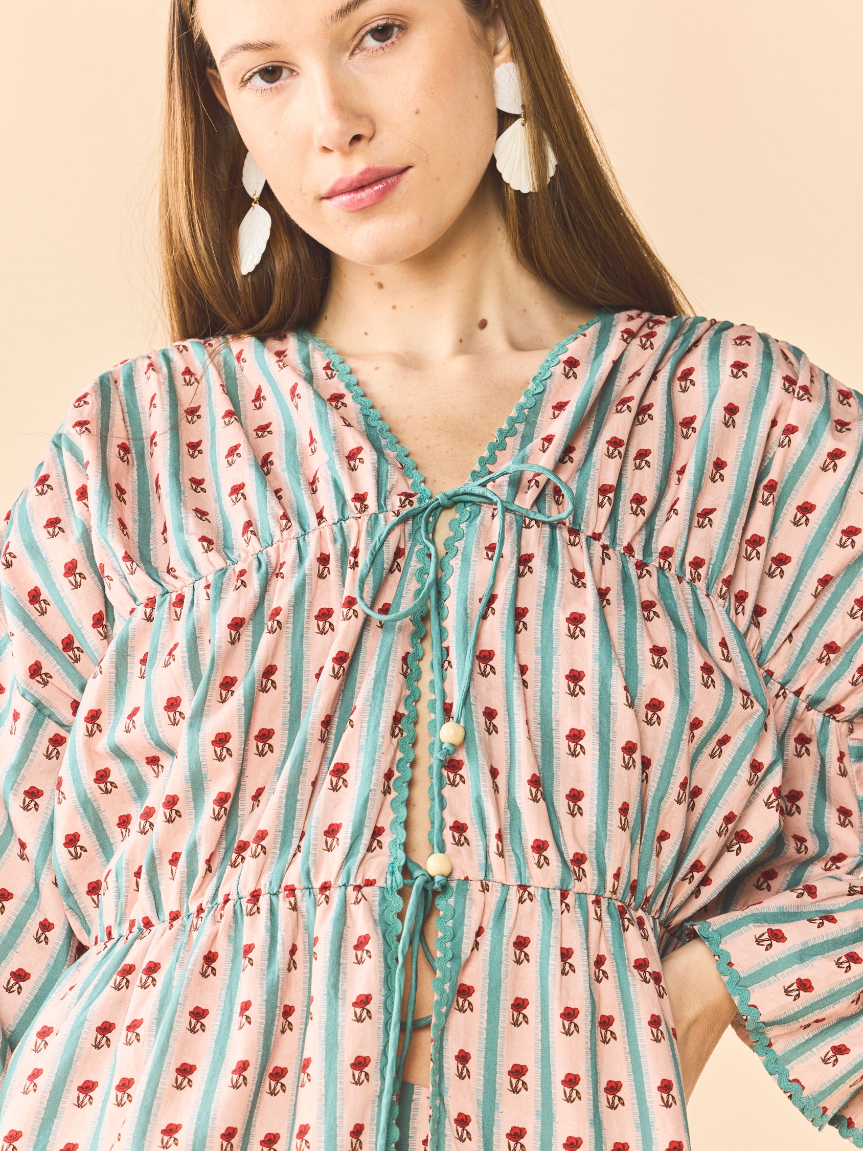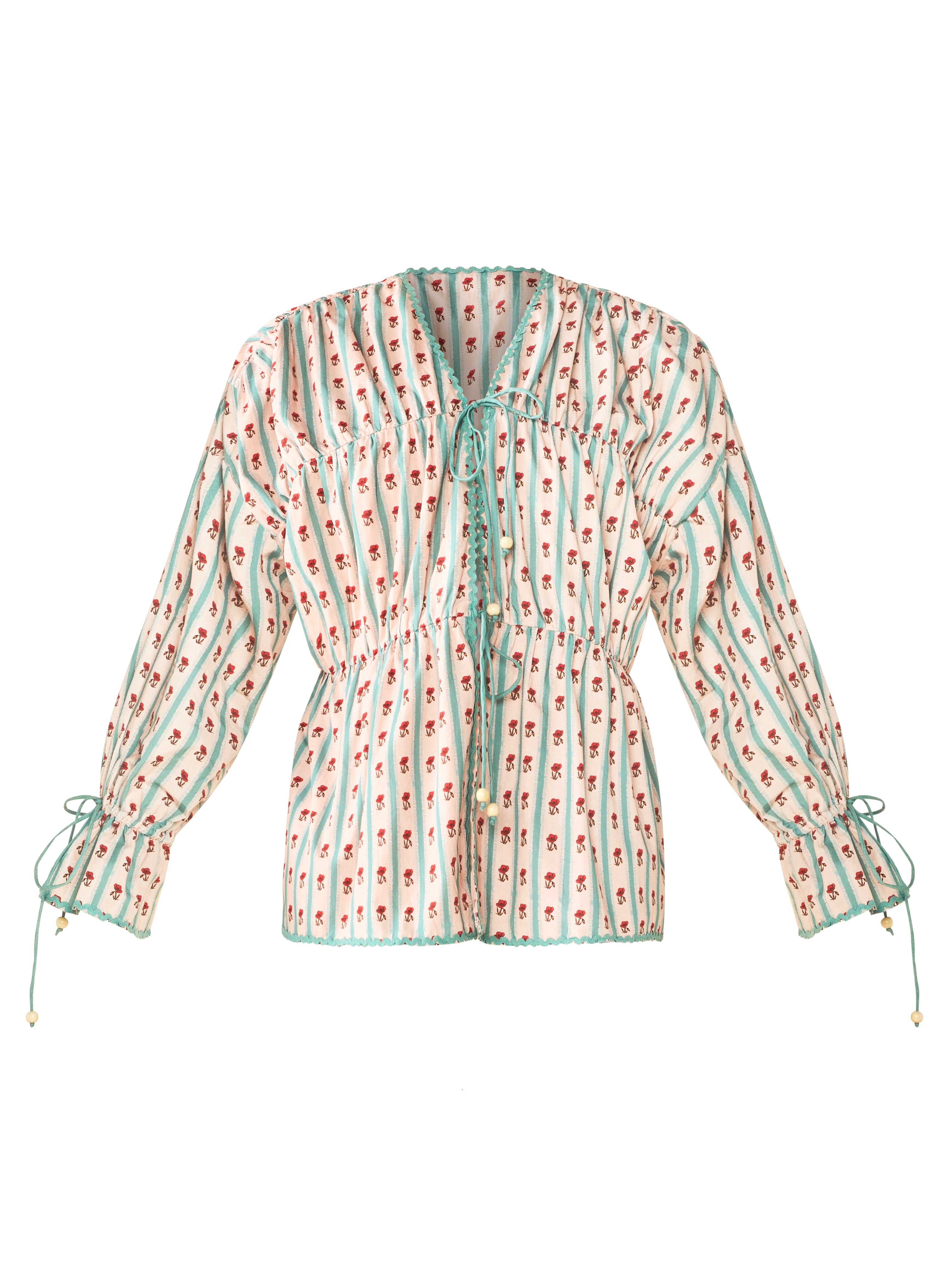 The Isle Top floats in airy cotton with a gathered silhouette that drapes just right. Scalloped ribbon trims the cuffs and hems, while a dainty floral print whispers romance all over. Light, easy, and endlessly wearable—she’s made for slow mornings, soft breezes, and everything in between.