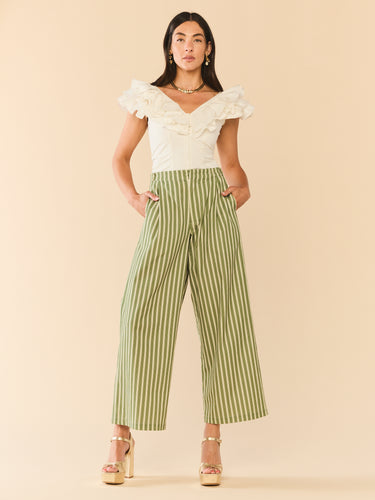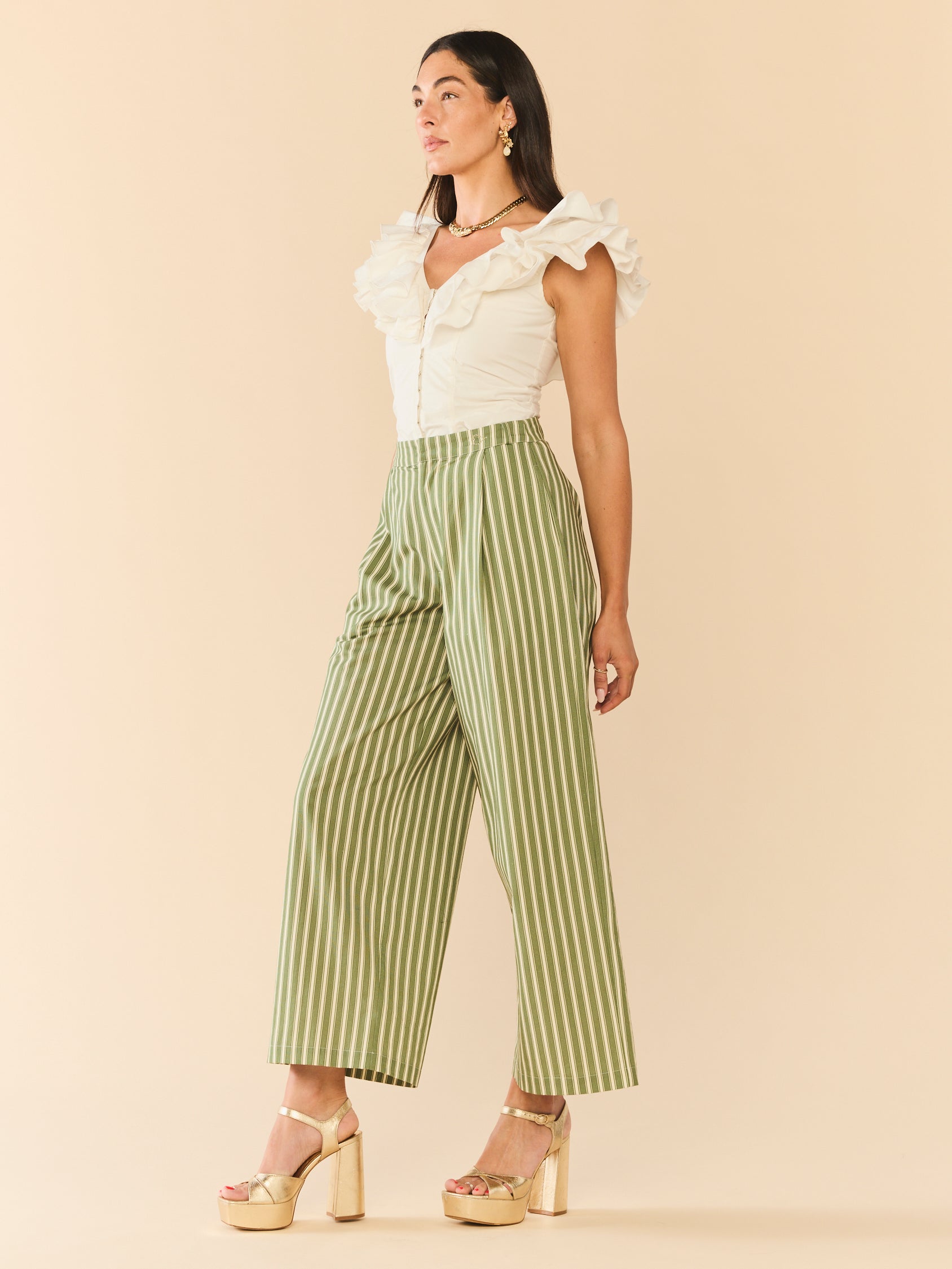 Introducing the Nina Pant, tailored trousers with a high-waist rise Featuring slanted side pocked and structured pleats. Offering adjustability with a zip fly with hook and bar closure. Finished with an ultra-wide leg, draping comfortable over your leg.