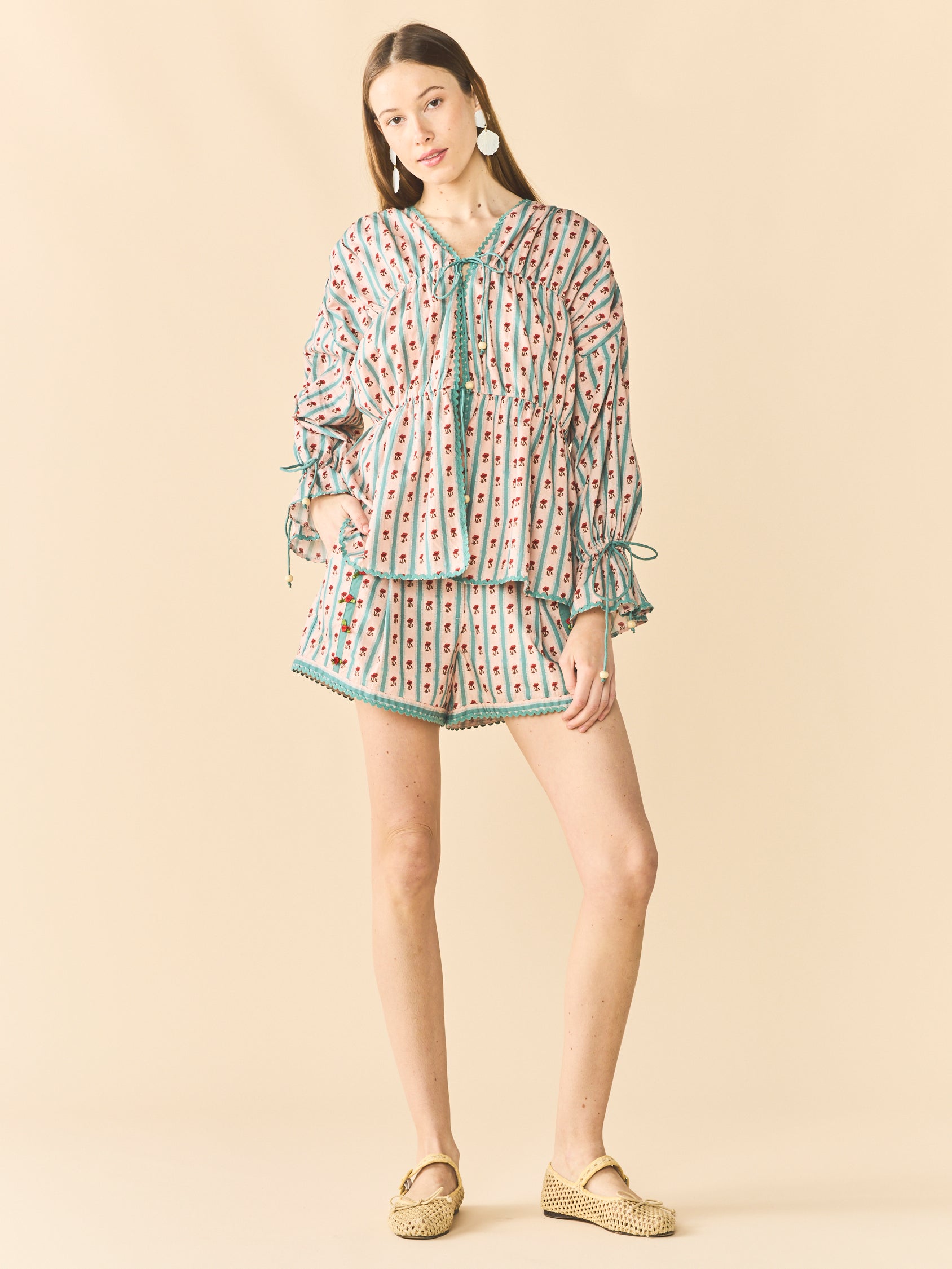 Playful and polished. The Lottie Shorts are crafted in lightweight cotton with a rosebud stripe print and scalloped trim. Contrast piping and soft pleats give them a vintage-inspired charm, while side pockets add everyday function. Easy to dress up or down—just add sun.
