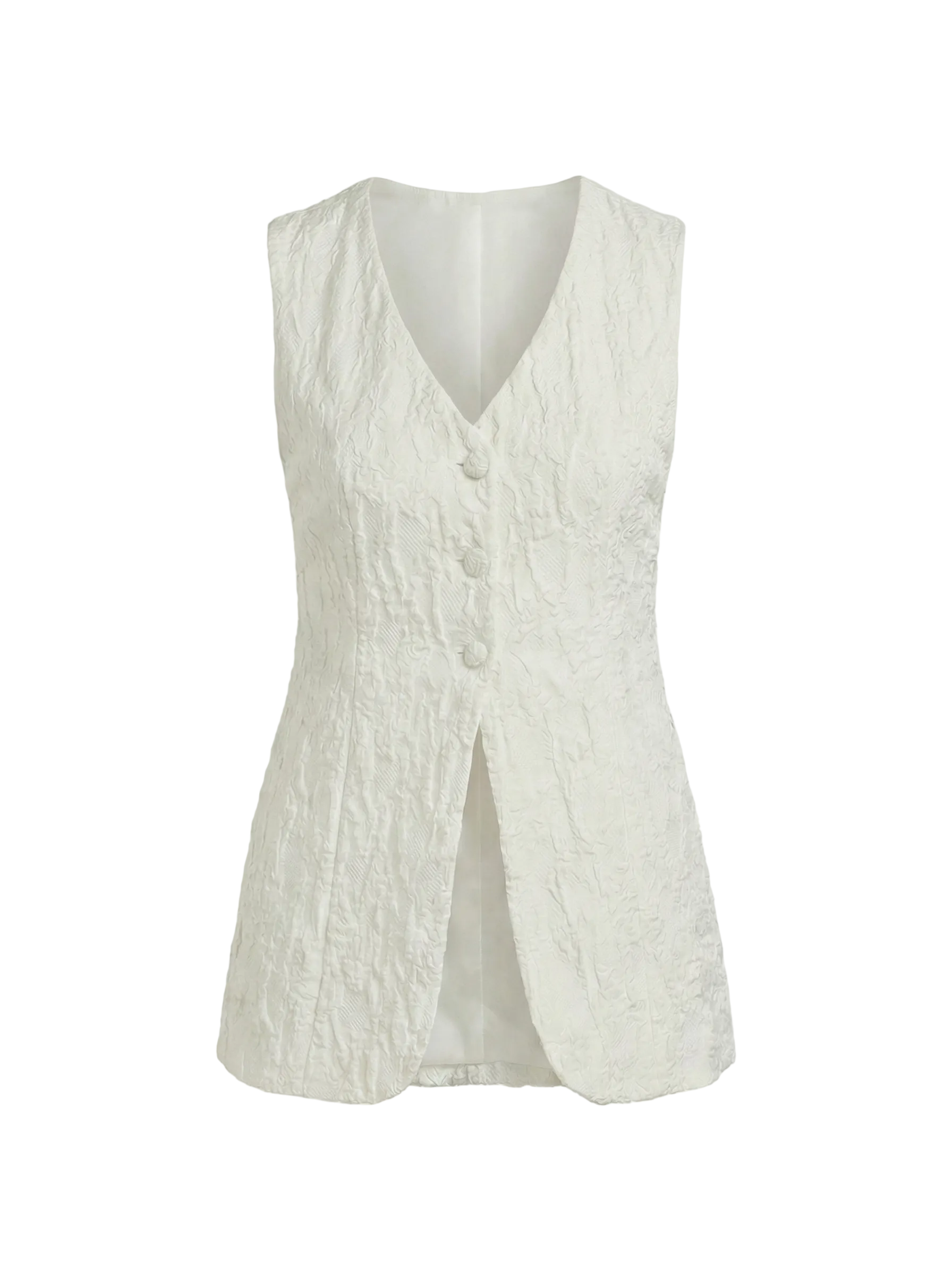 Meet Alexa, a chic, tailored vest designed to bring quiet structure to soft moments. Cut for a sleek, flattering fit, this piece features a deep V-neckline and a full button-front closure that feels equal parts classic and cool. Softly contoured seams create subtle shaping, while the floral quilted texture adds dimension and romance. Crafted in a floral quilted fabric inspired by vintage Parisian textiles Becca discovered at Marché aux Puces de Saint-Ouen.