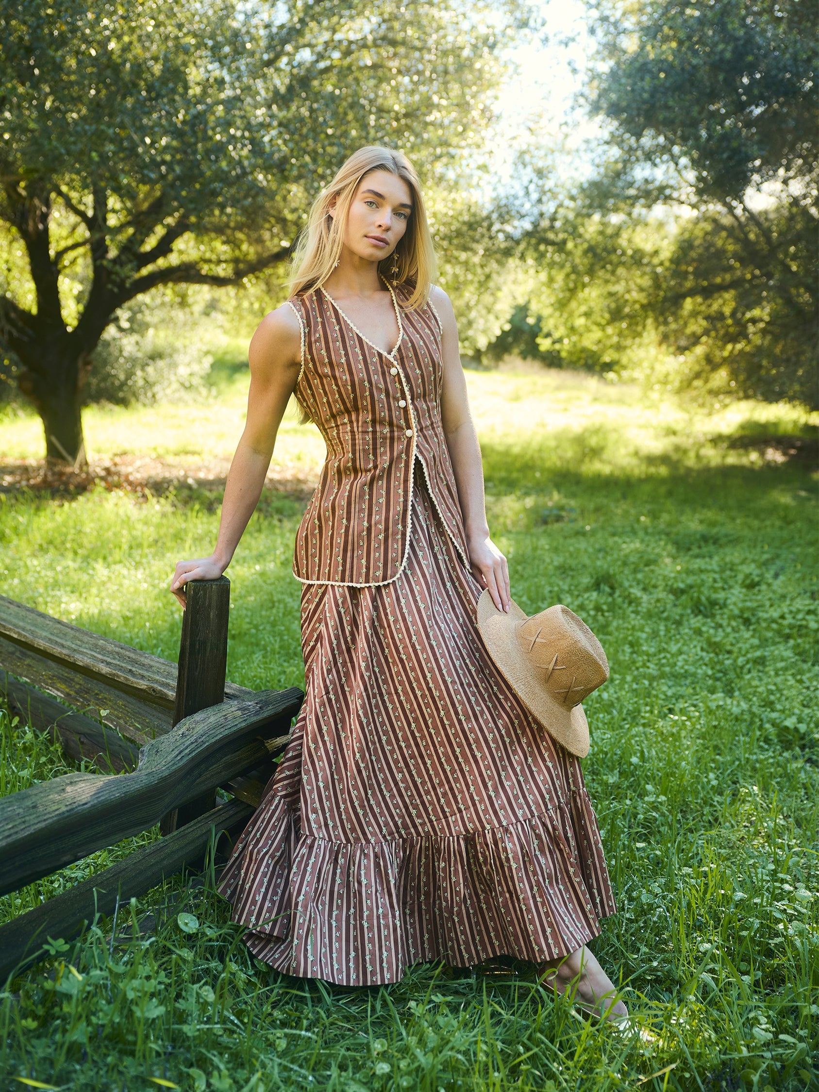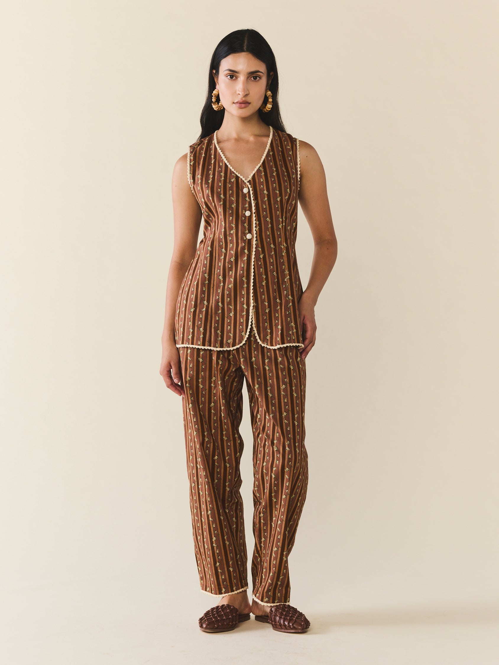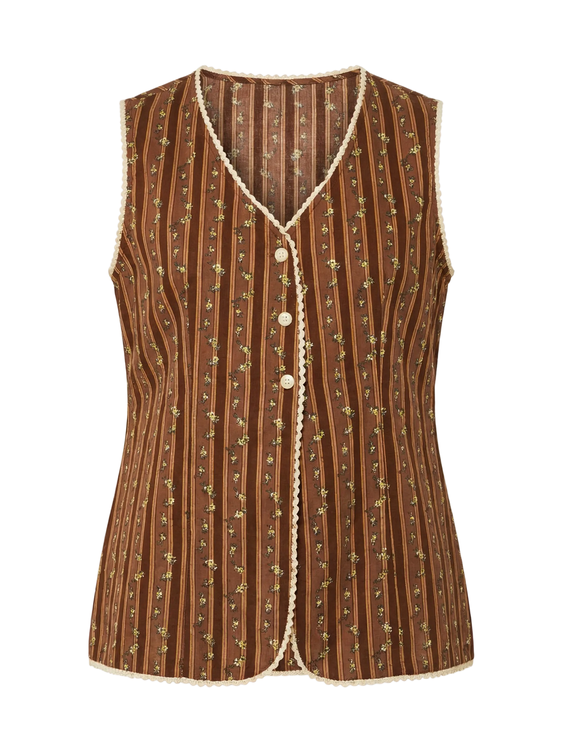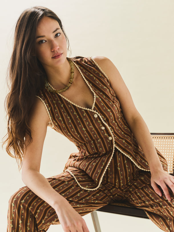 Meet Alexa, a chic tailored vest. This top showcases a stunning collaboration with artist Larsen McDowell, featuring vibrant floral artwork set against classic chocolate stripes. Structured and cut for a sleek fit, finished with top to bottom buttons.
