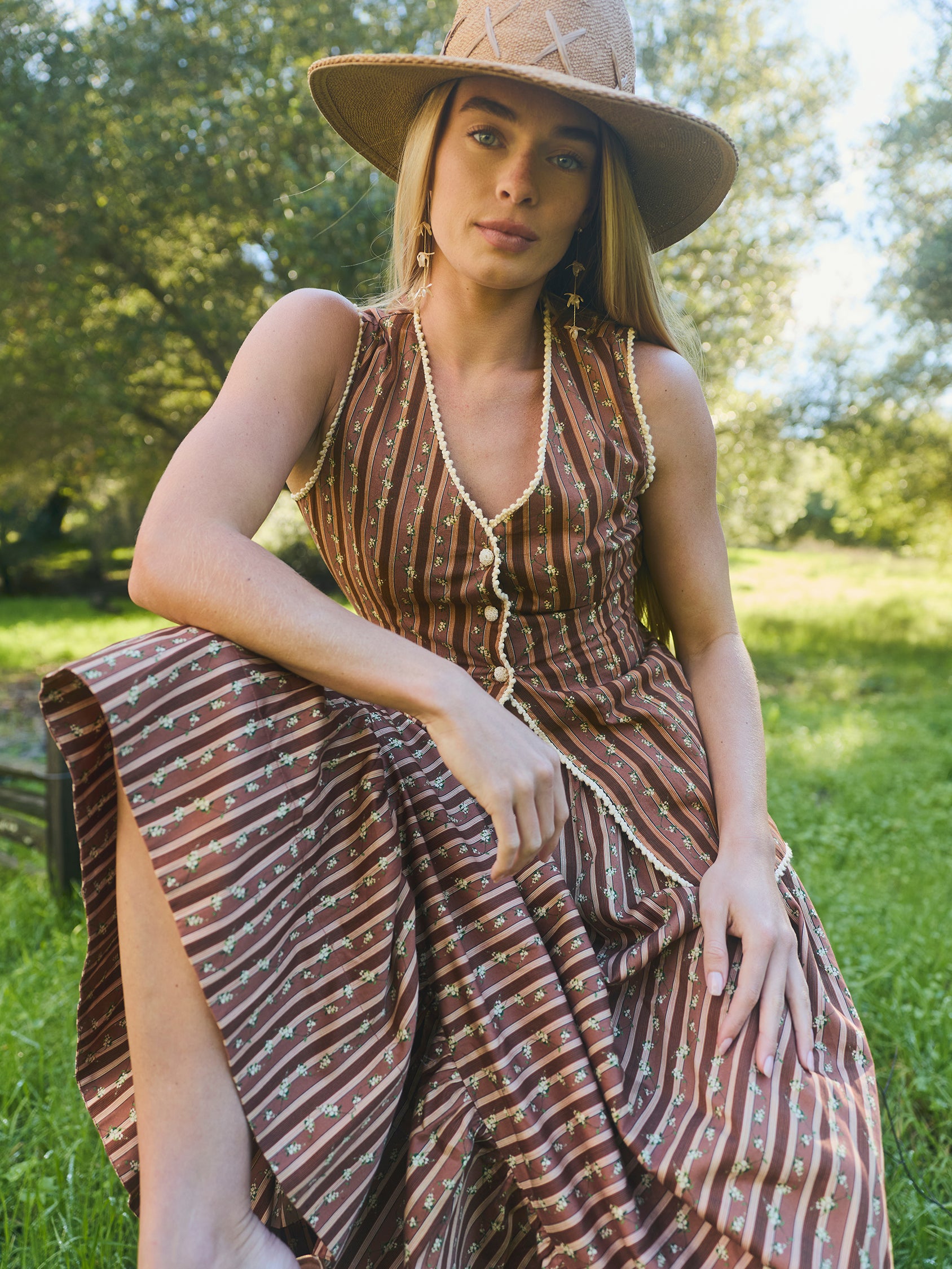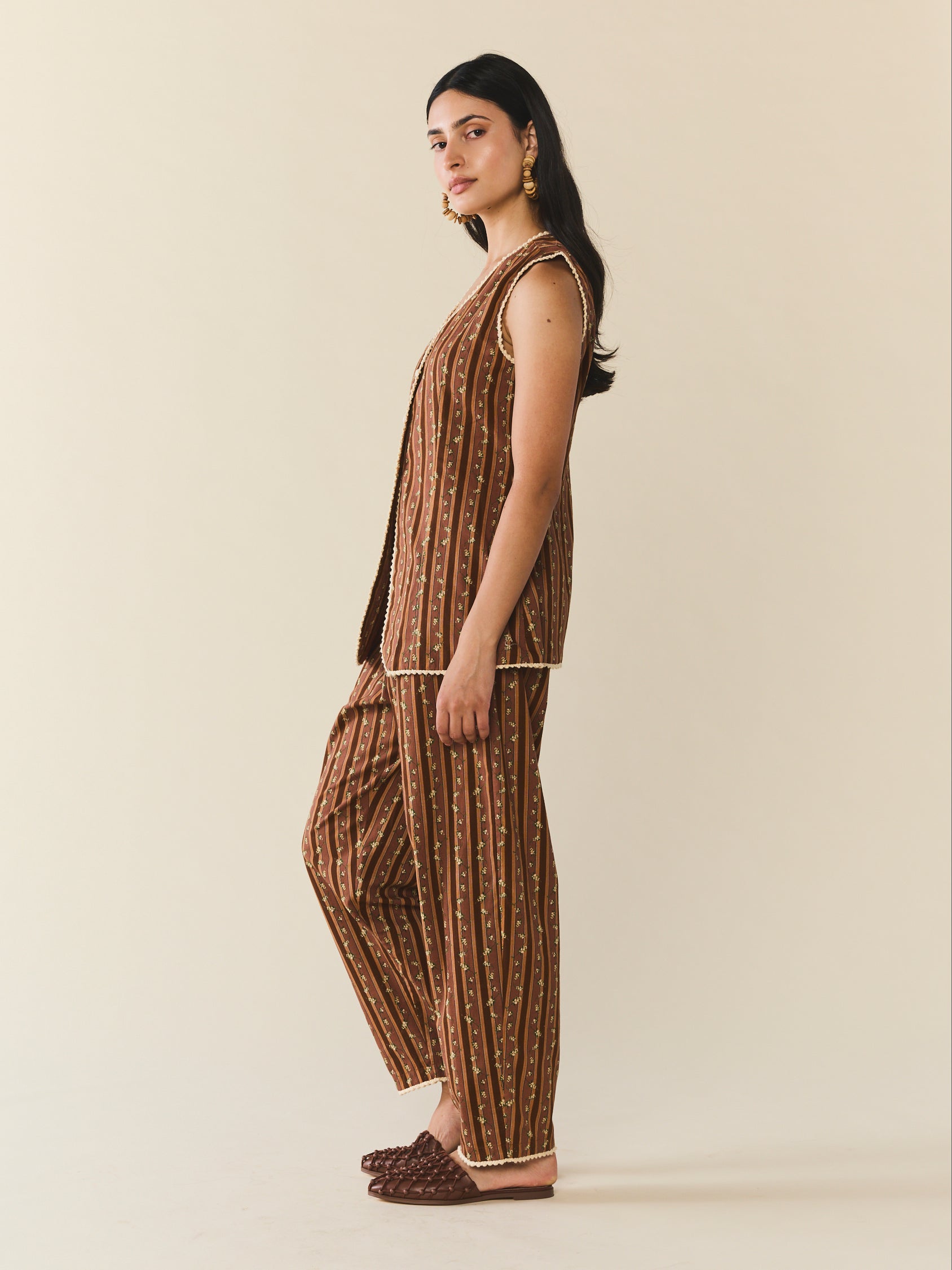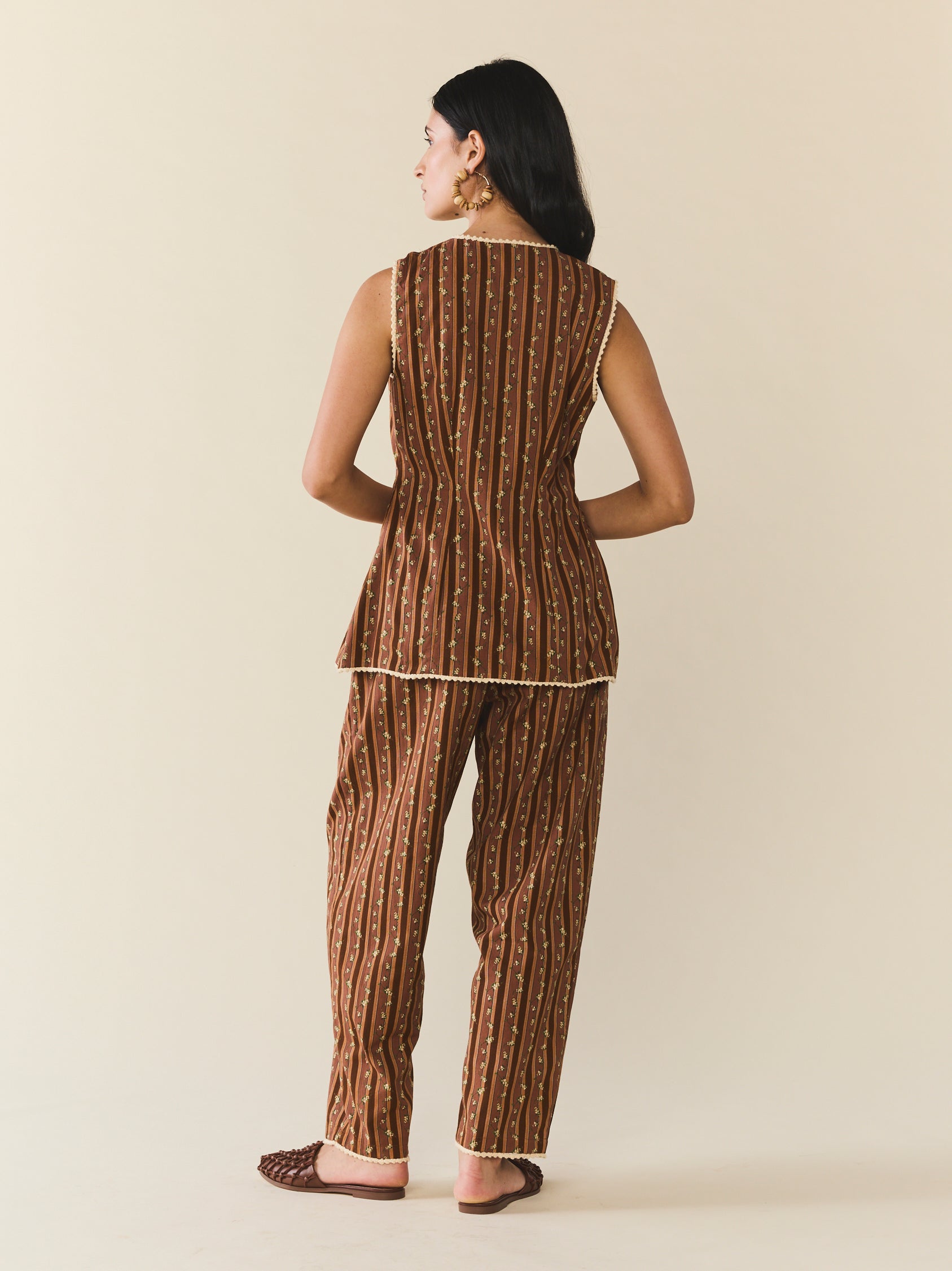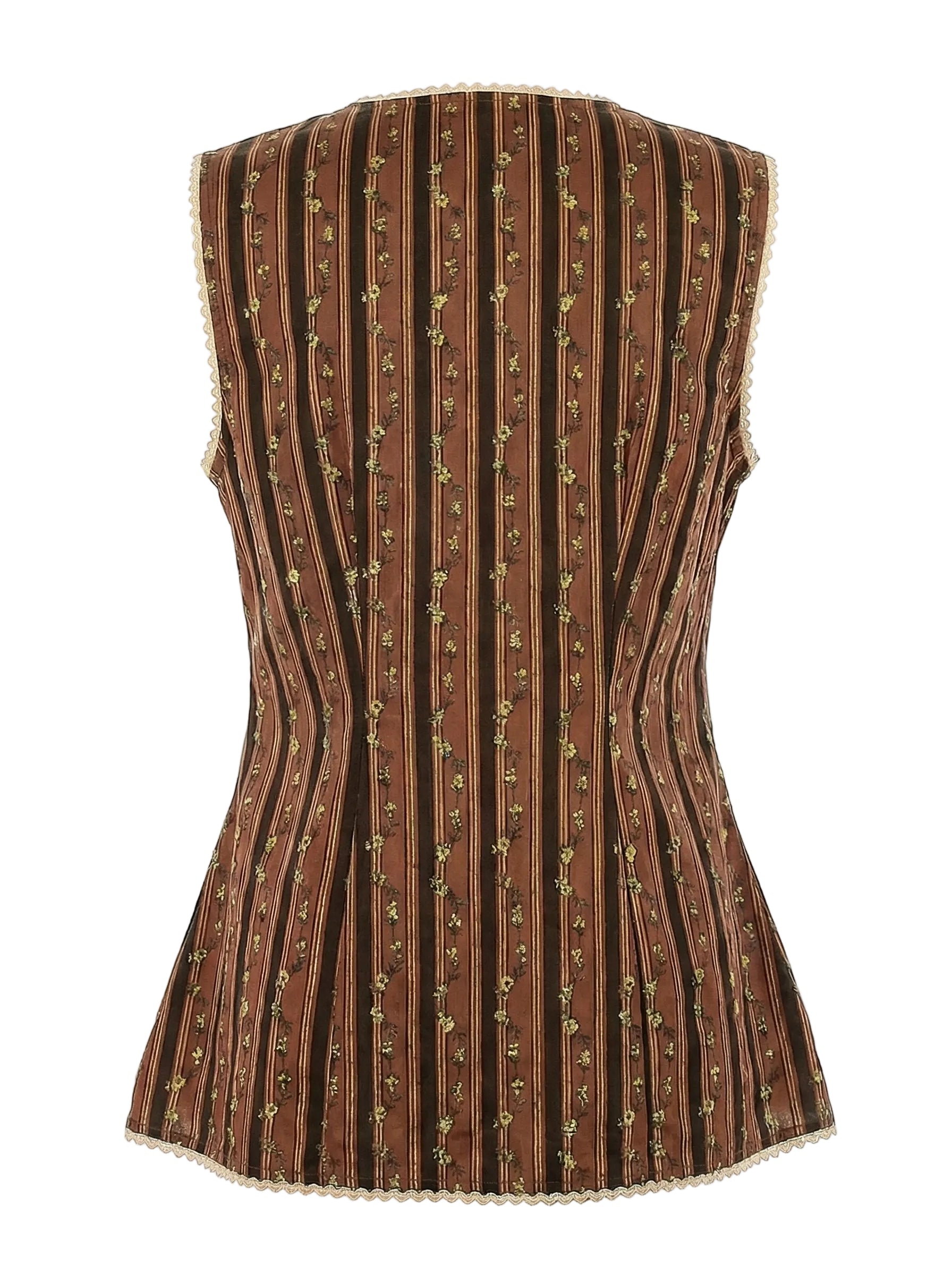 Meet Alexa, a chic tailored vest. This top showcases a stunning collaboration with artist Larsen McDowell, featuring vibrant floral artwork set against classic chocolate stripes. Structured and cut for a sleek fit, finished with top to bottom buttons.