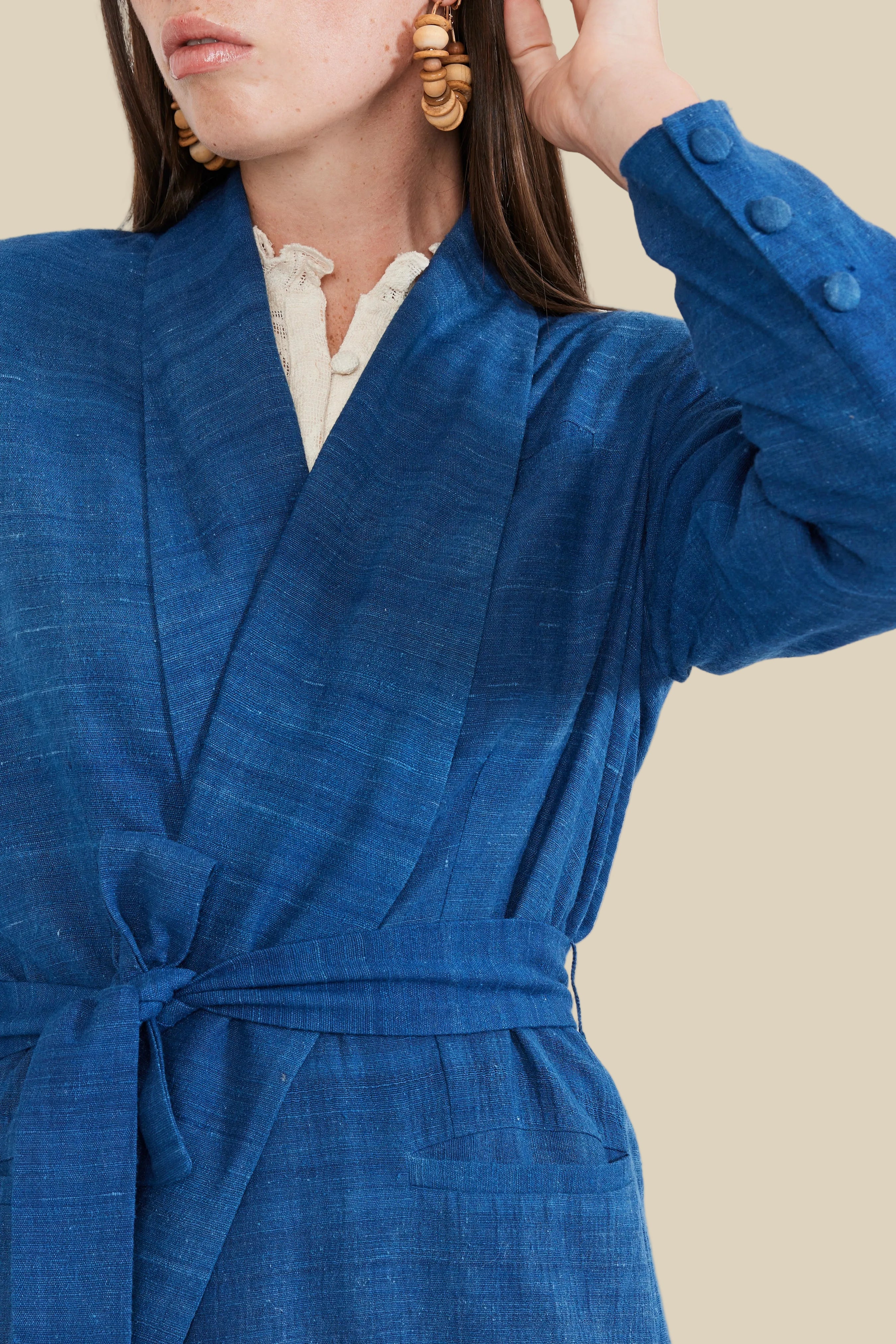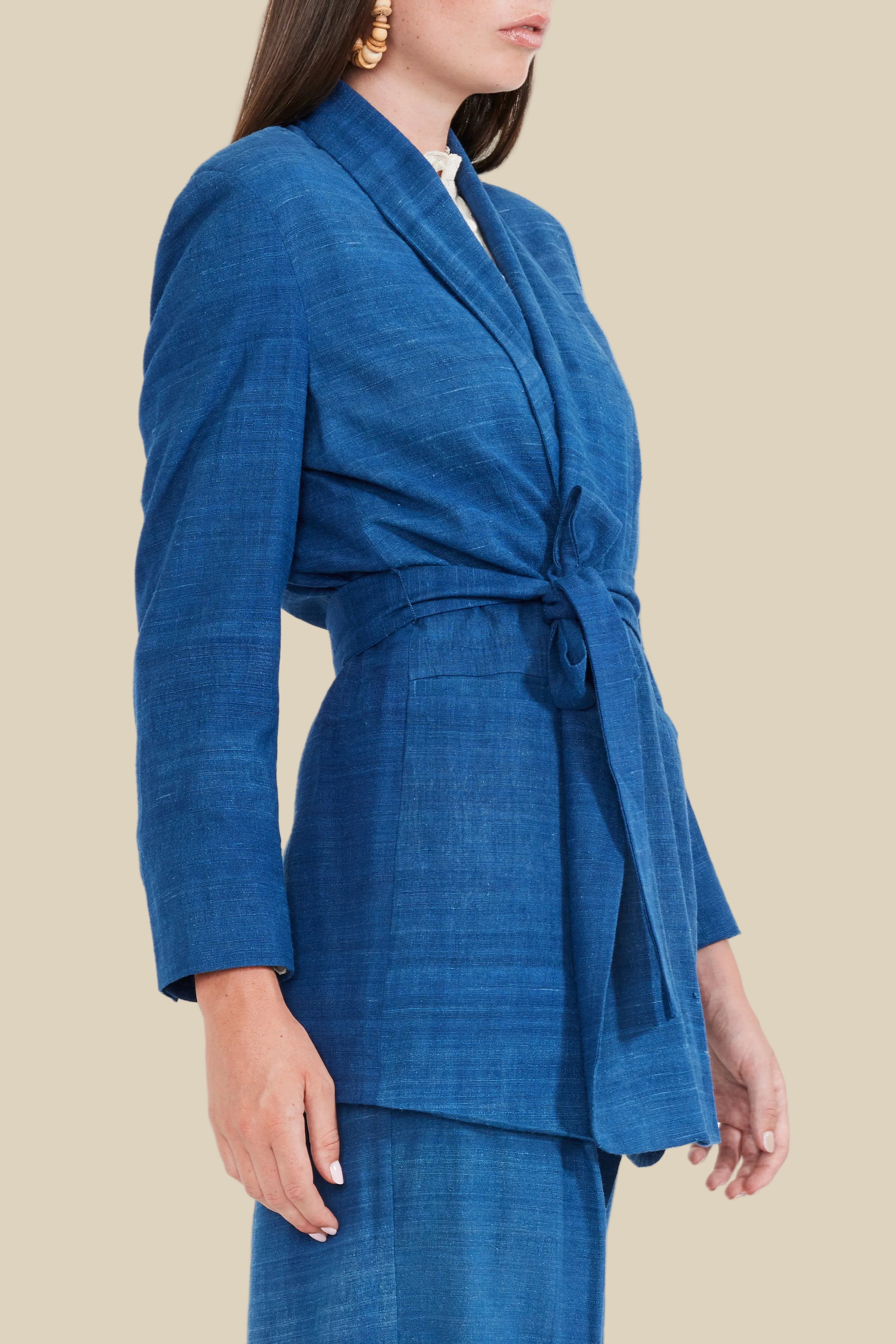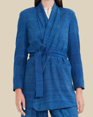 Tailored in indigo dyed organic silk, this blazer is a twist on the traditional structured suit jacket. More relaxed of a fit and longer length passes less serious vibes, while the shoulder pads, fabric covered bold button detailing, and handkerchief left breast pocket shows you still mean business. Remove-able waist belt offering options for wear.