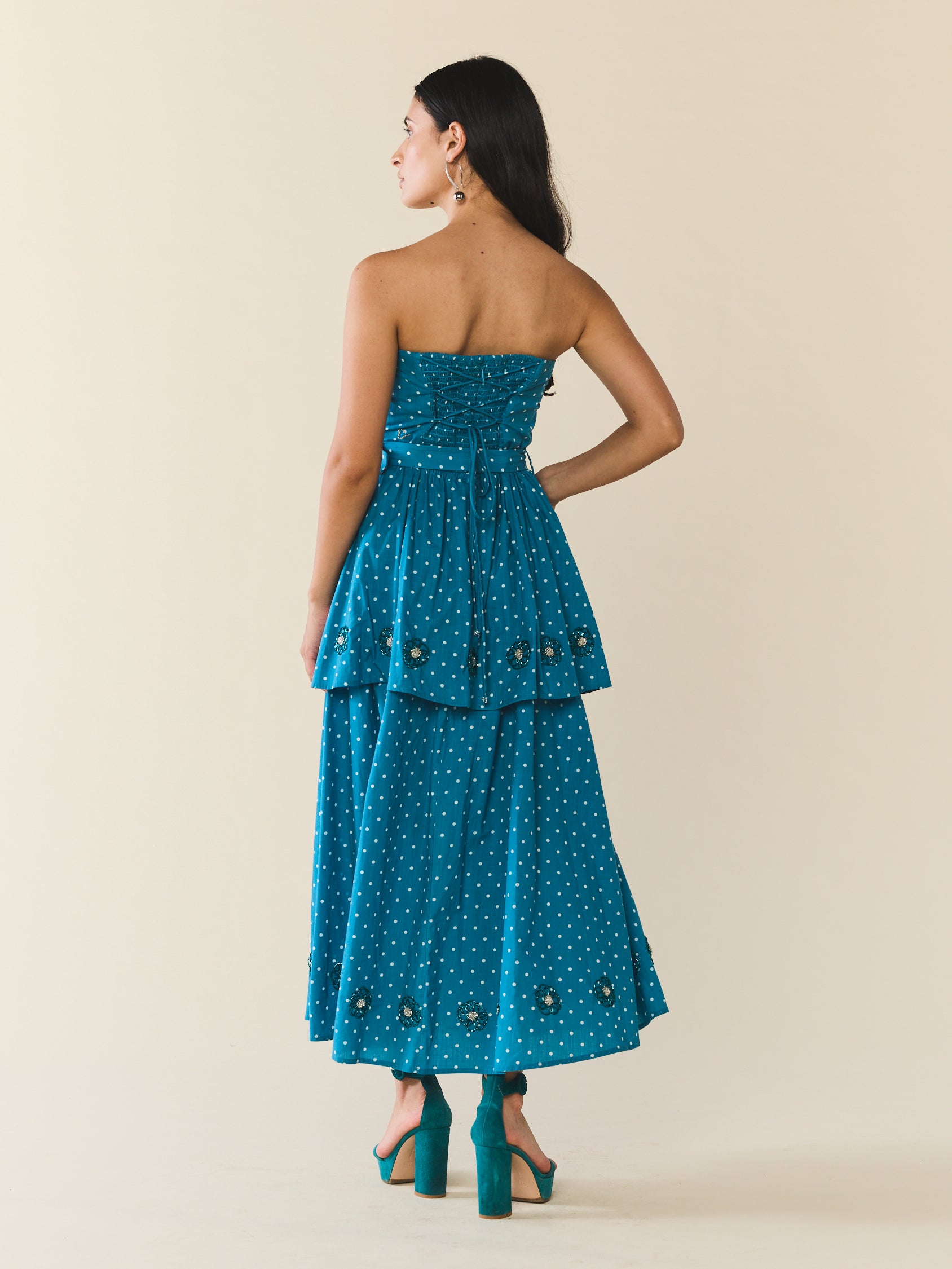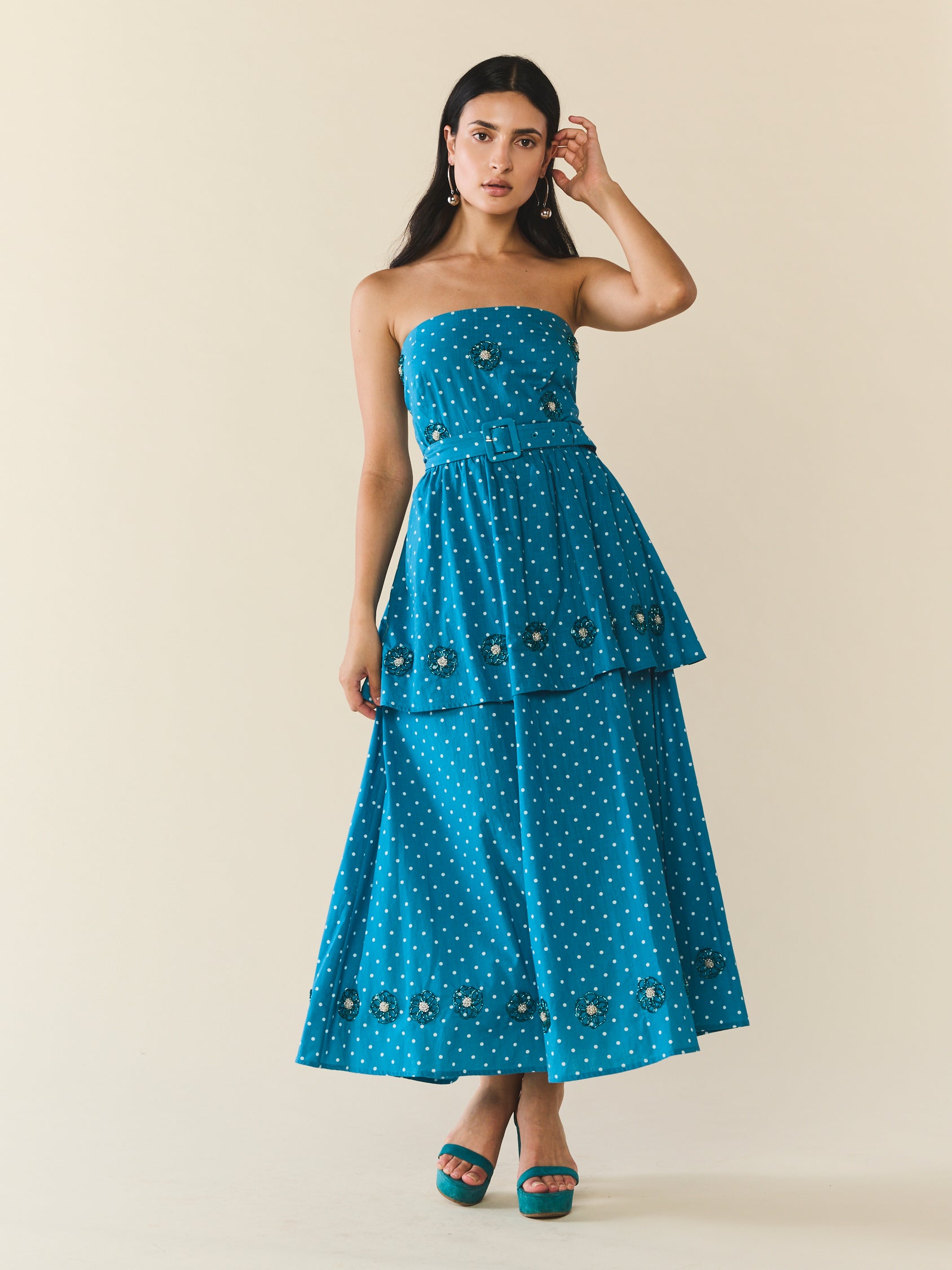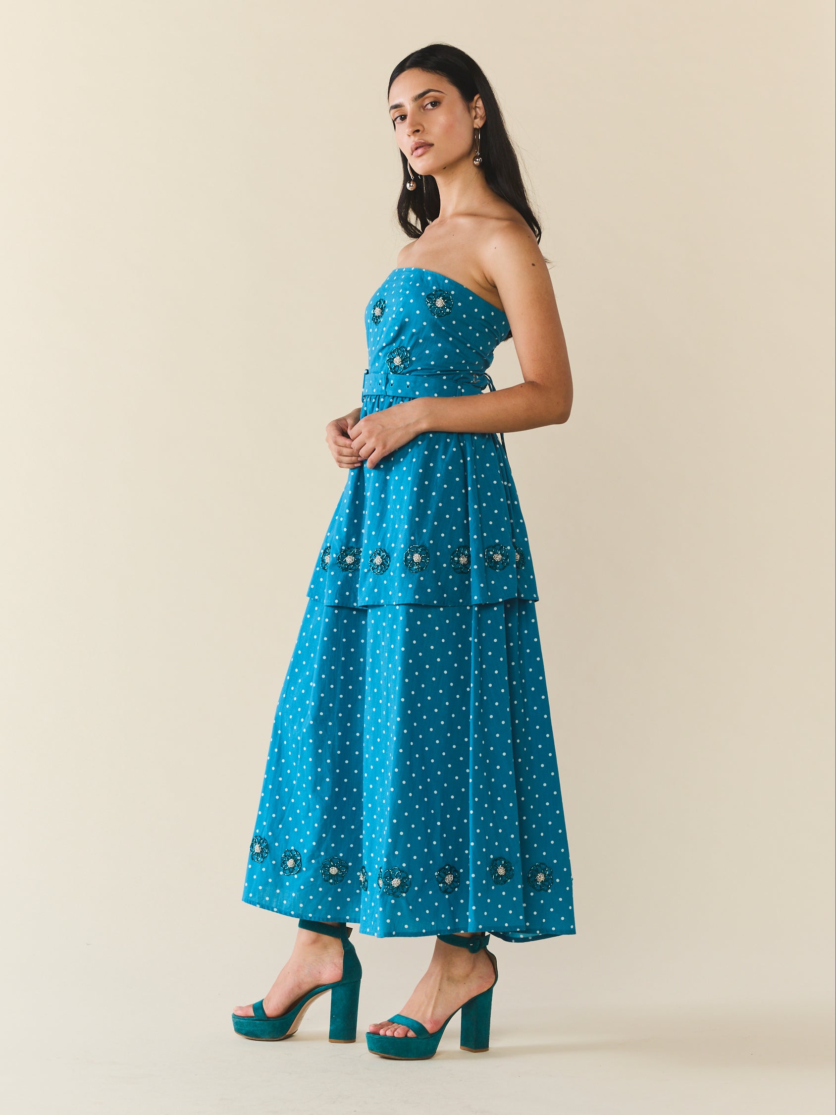 Introducing the Daisy, this bold midi dress is meant for a party. Its' strapless silhouette, enhanced by a smocked back, zipper closure, and belted waist ensures a flattering fit that moves with you. As you make your entrance, the beaded florals careful placed throughout adding a touch of whimsy.
