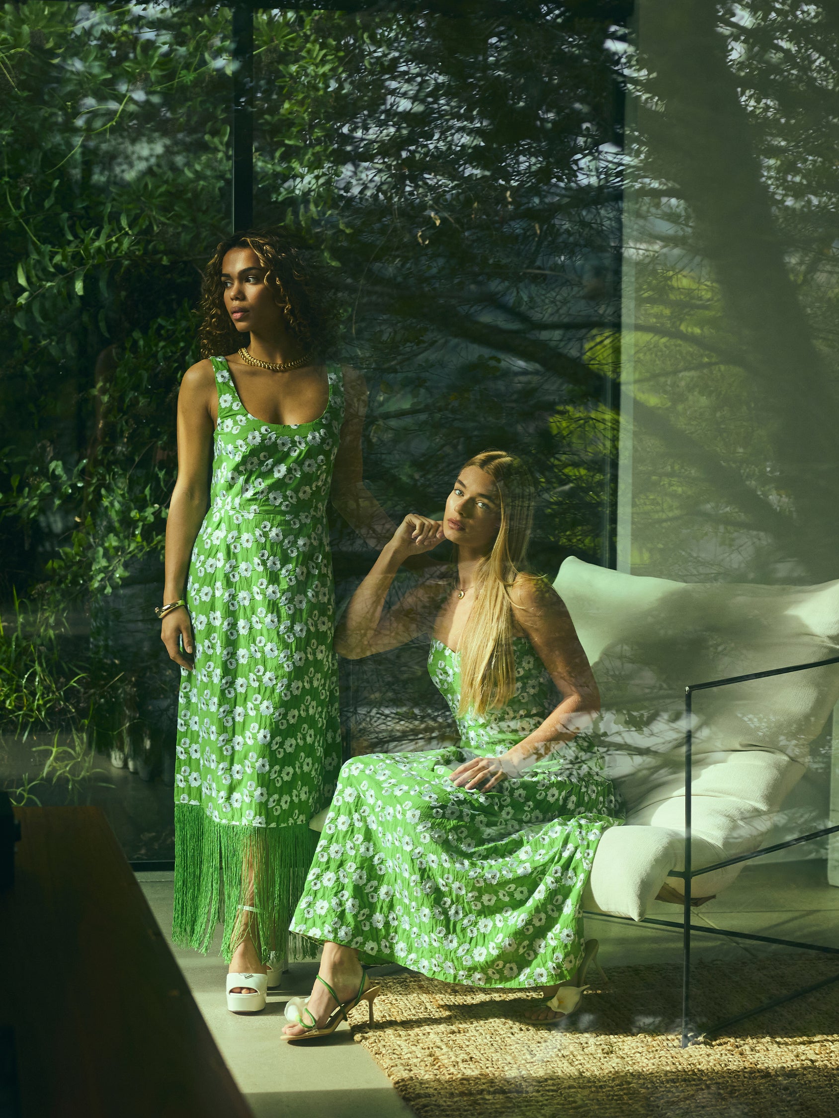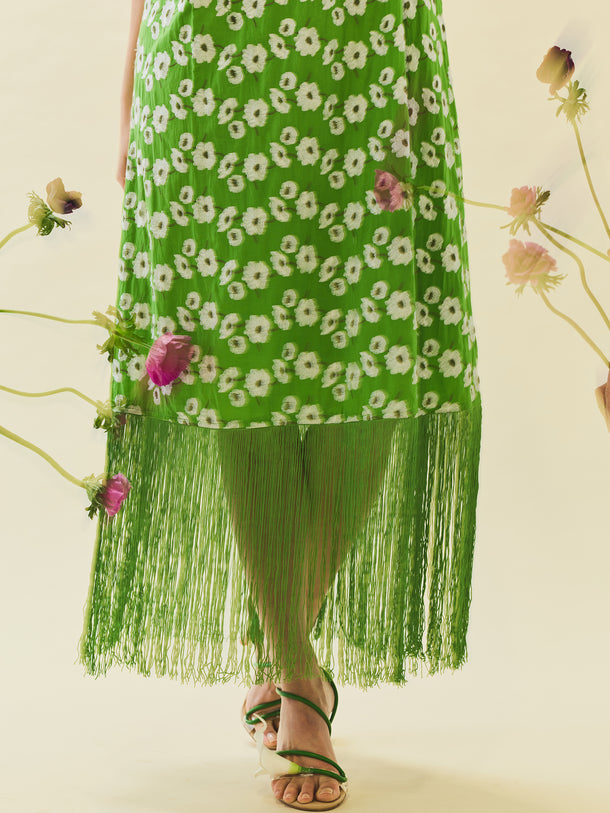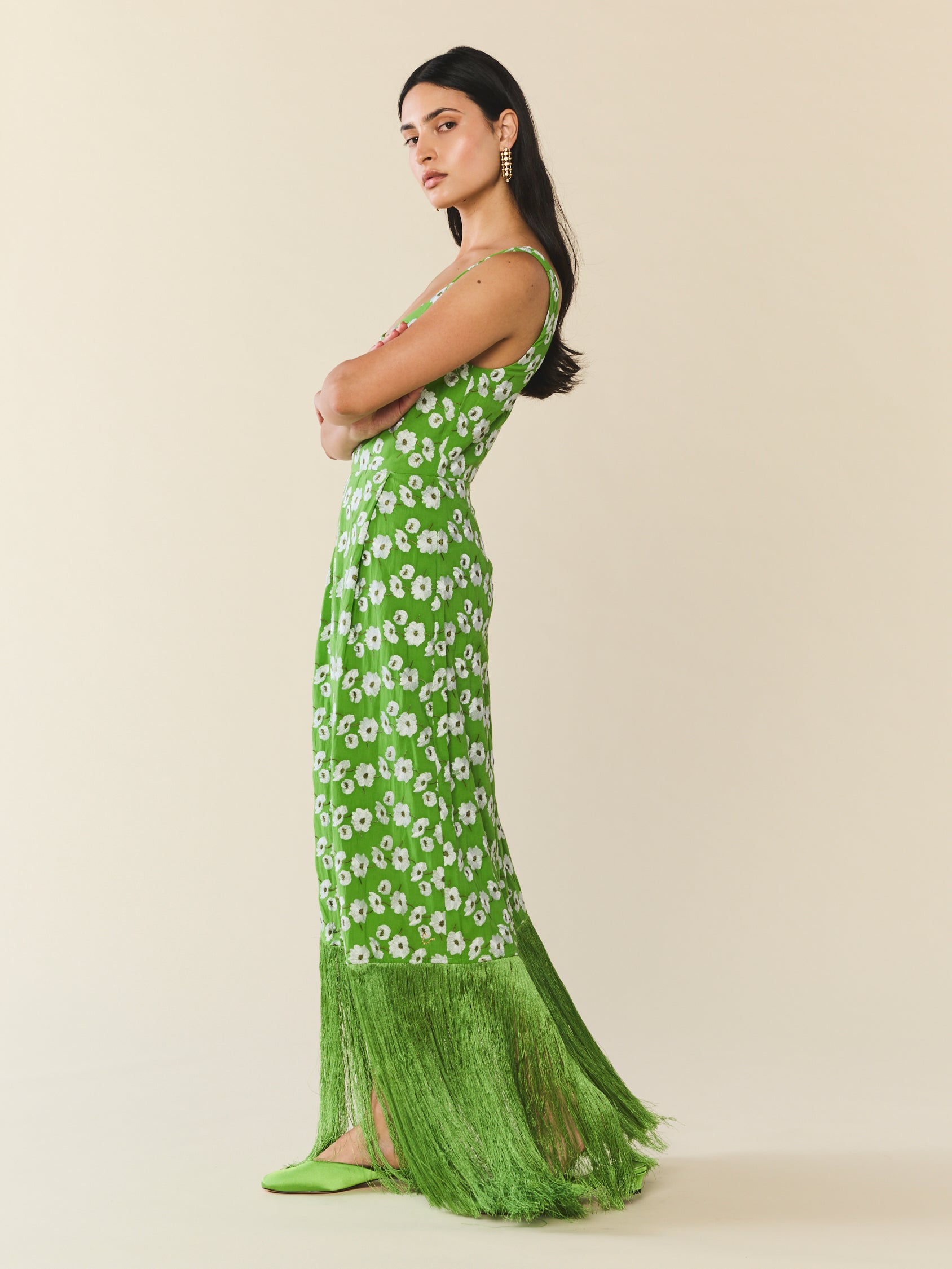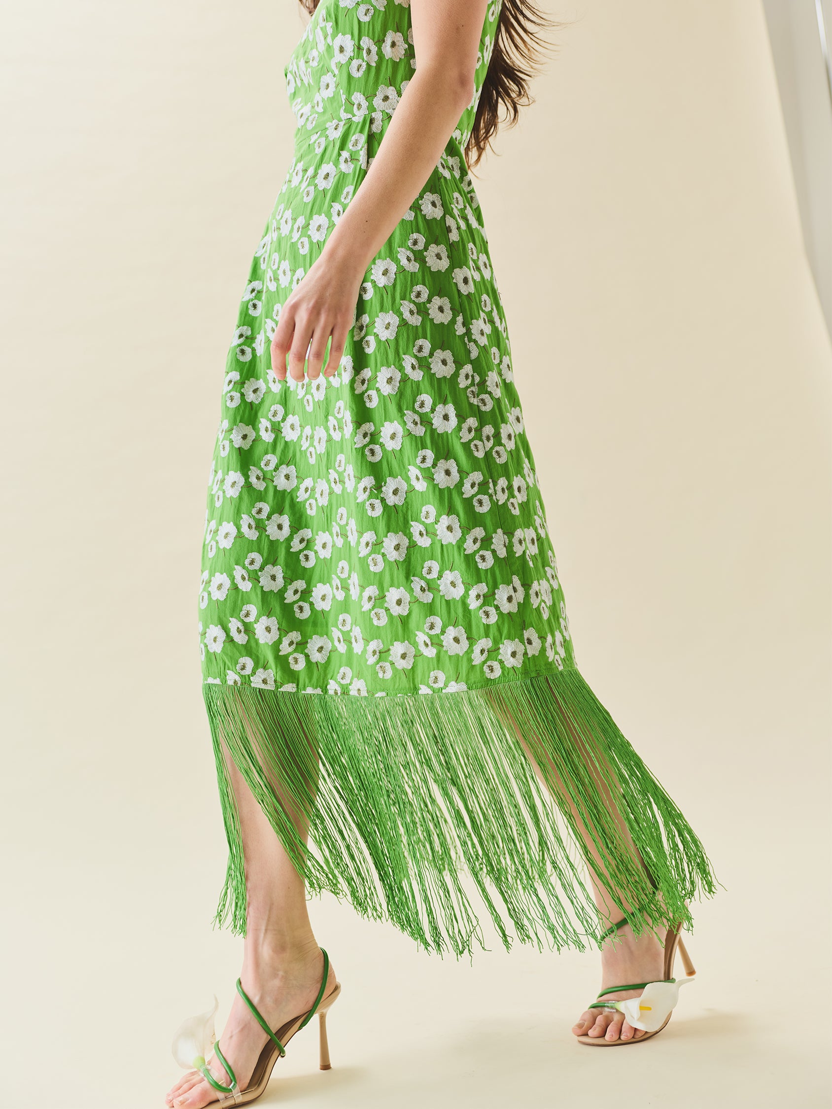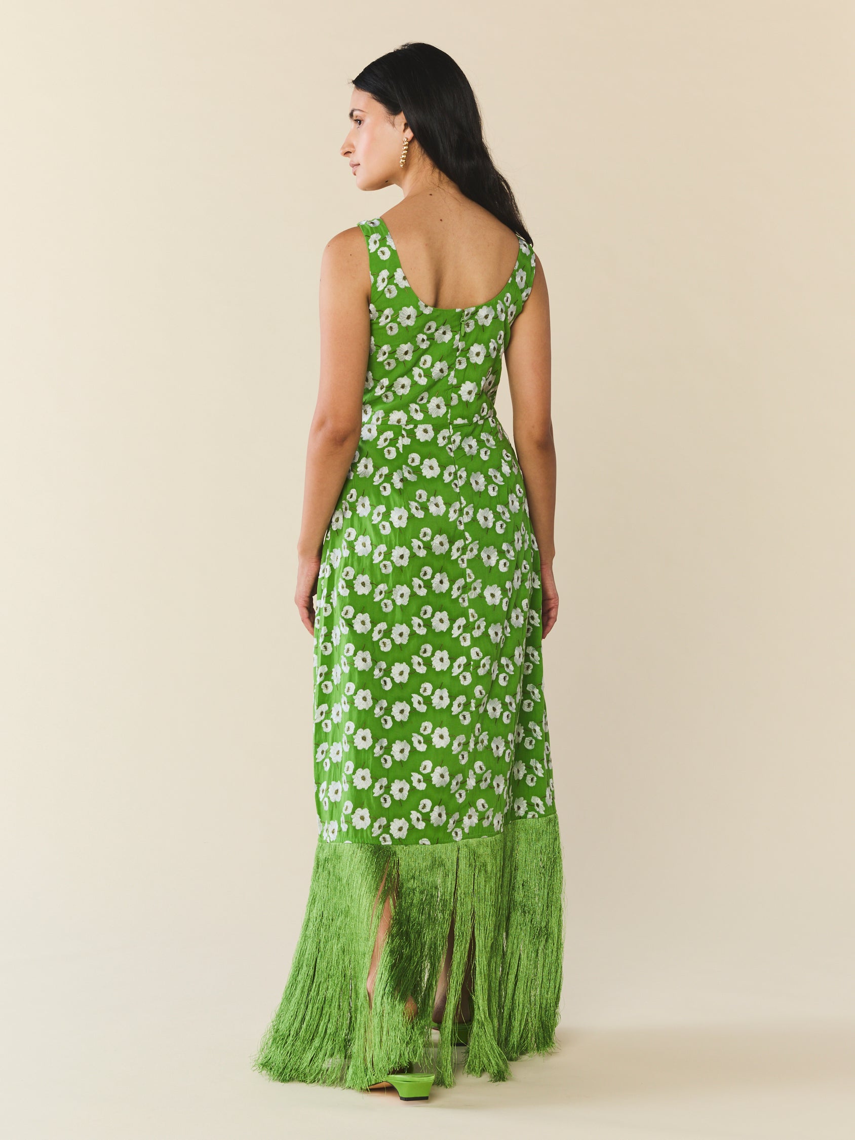 Introducing the Hannah Dress, a chic and vibrant maxi that brings a fresh perspective to your party wardrobe with its bold green hue and allover floral embroidery. This sleek silhouette features a flattering scoop neckline and a fitted bodice, flowing into a graceful skirt that serves as a canvas for the striking tonal fringe-lined hem. The dramatic fringe detail is ready for the dance floor, adding a sense of playfulness and movement to every step you take. Designed with an invisible center back zipper for a clean finish.