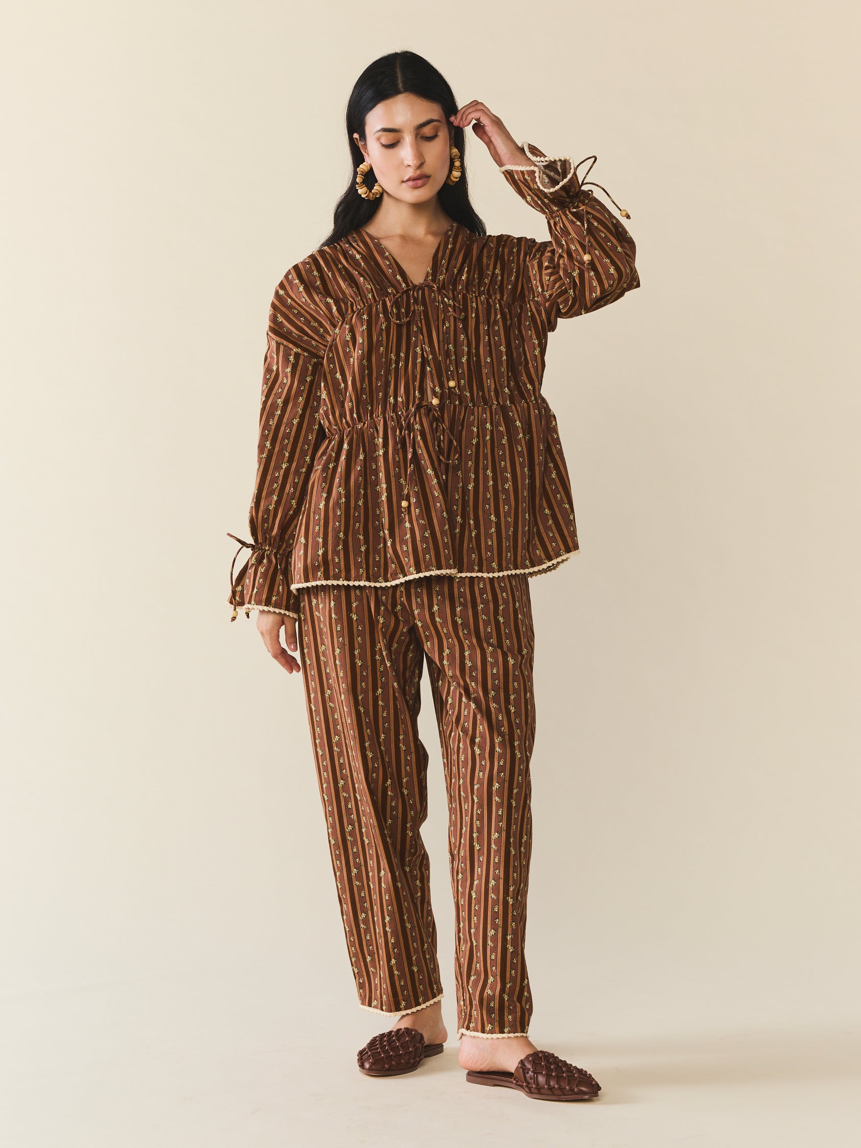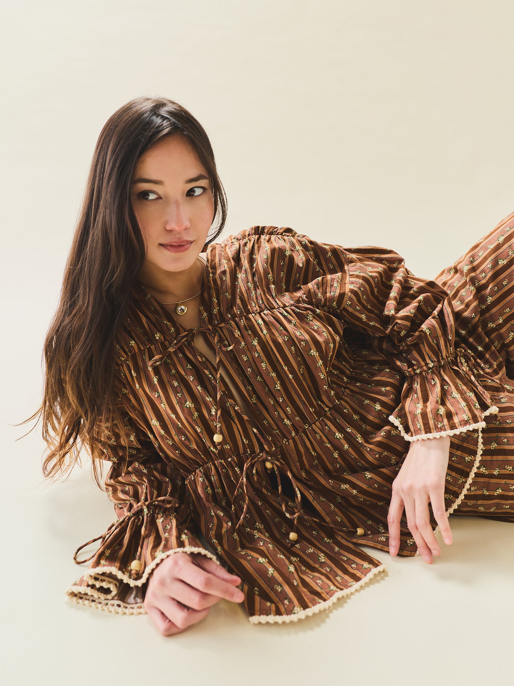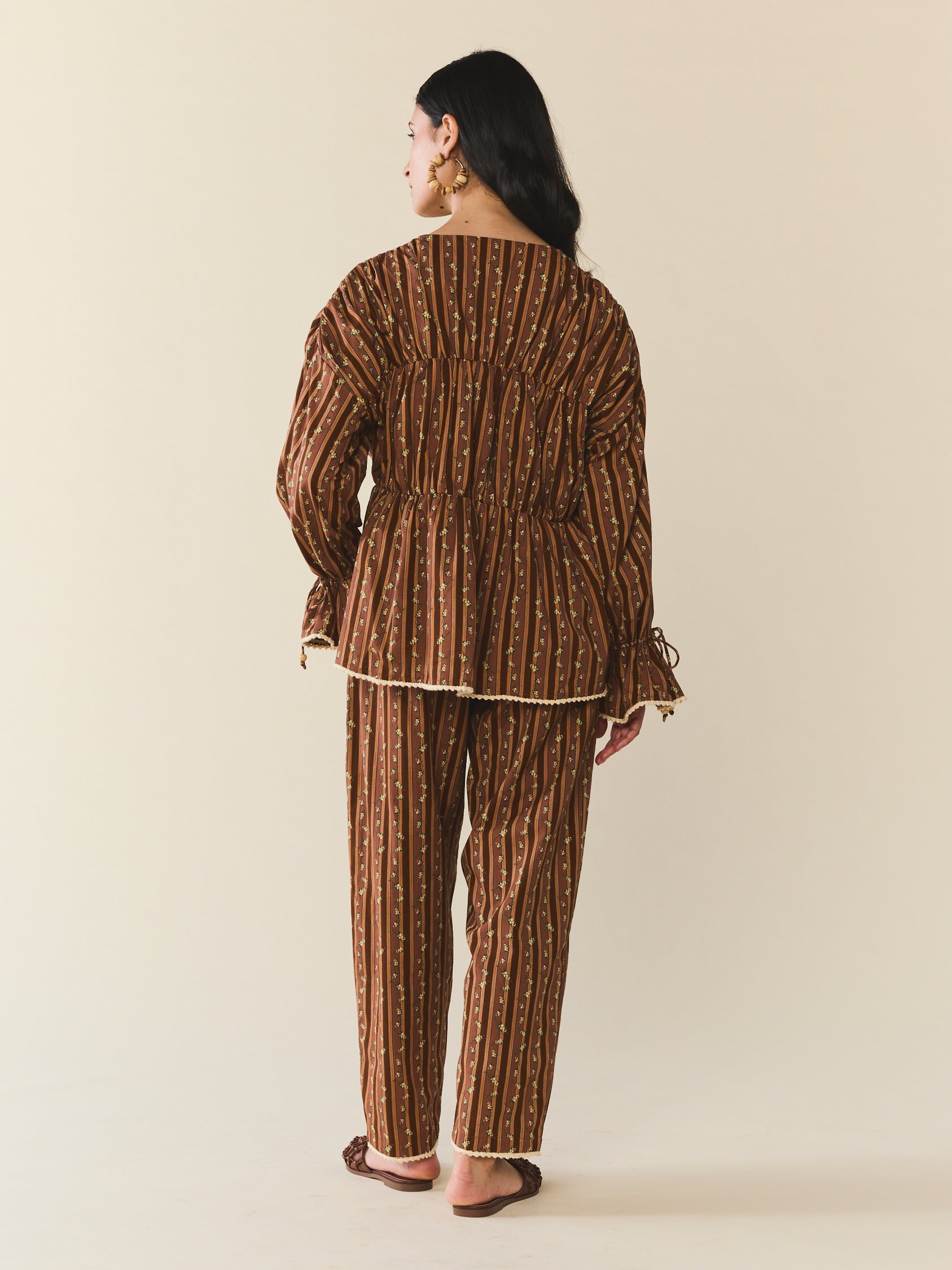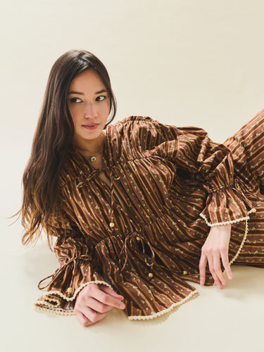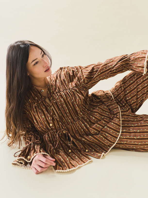The Isle Top floats in airy cotton with a gathered silhouette that drapes just right. Delicate cream ric-rac trim the cuffs and hems, while a dainty floral print whispers romance all over. This easy silhouette showcases a stunning collaboration with artist Larsen McDowell, featuring vibrant floral artwork set against classic chocolate stripes. Light, easy, and endlessly wearable, she’s made for slow mornings, soft breezes, and everything in between.