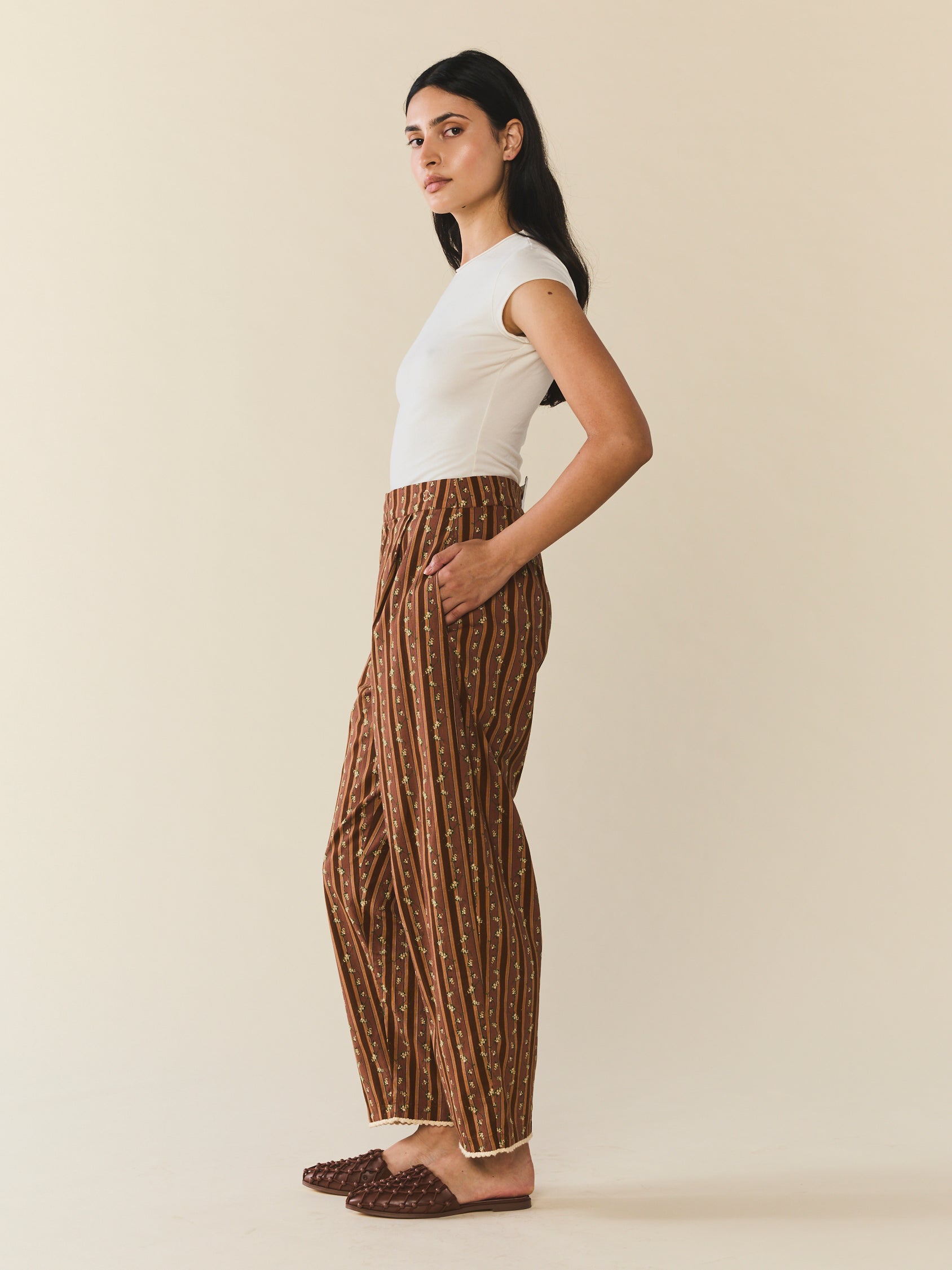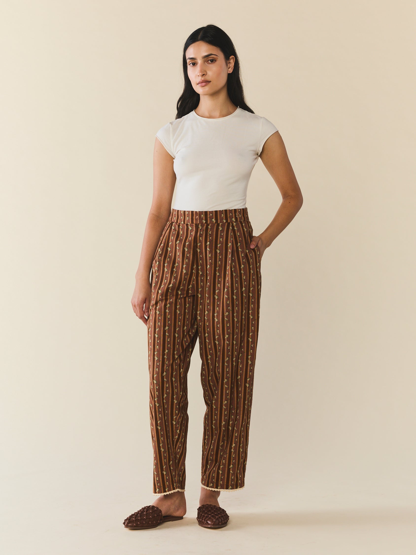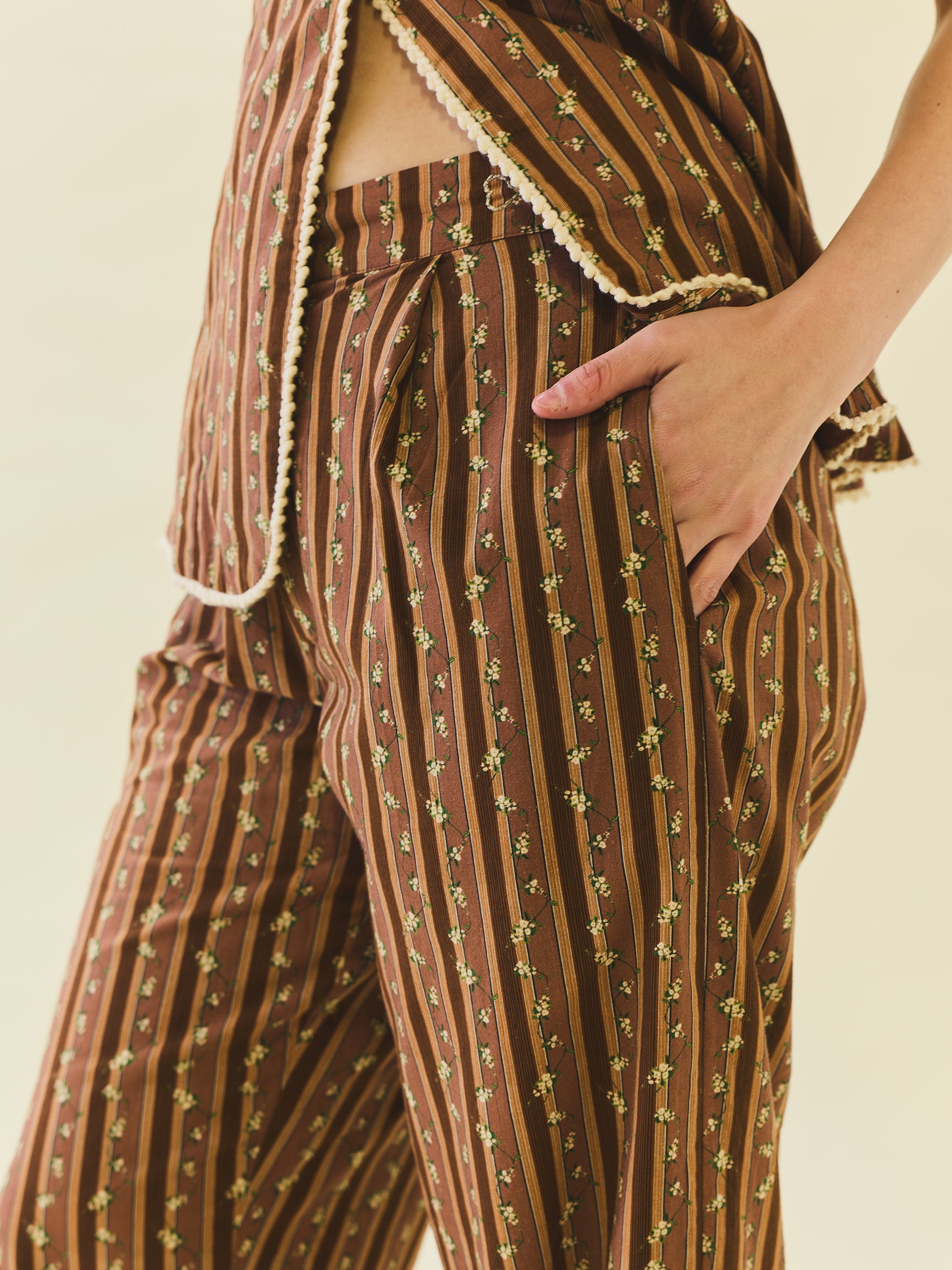 Introducing the Nina Pant, tailored trousers with a high-waist rise showcases a stunning collaboration with artist Larsen McDowell, featuring vibrant floral artwork set against classic chocolate stripes. . Featuring slanted side pocked and structured pleats. Offering adjustability with a zip fly with hook and bar closure. Finished with an wide leg, draping comfortable over your leg.
