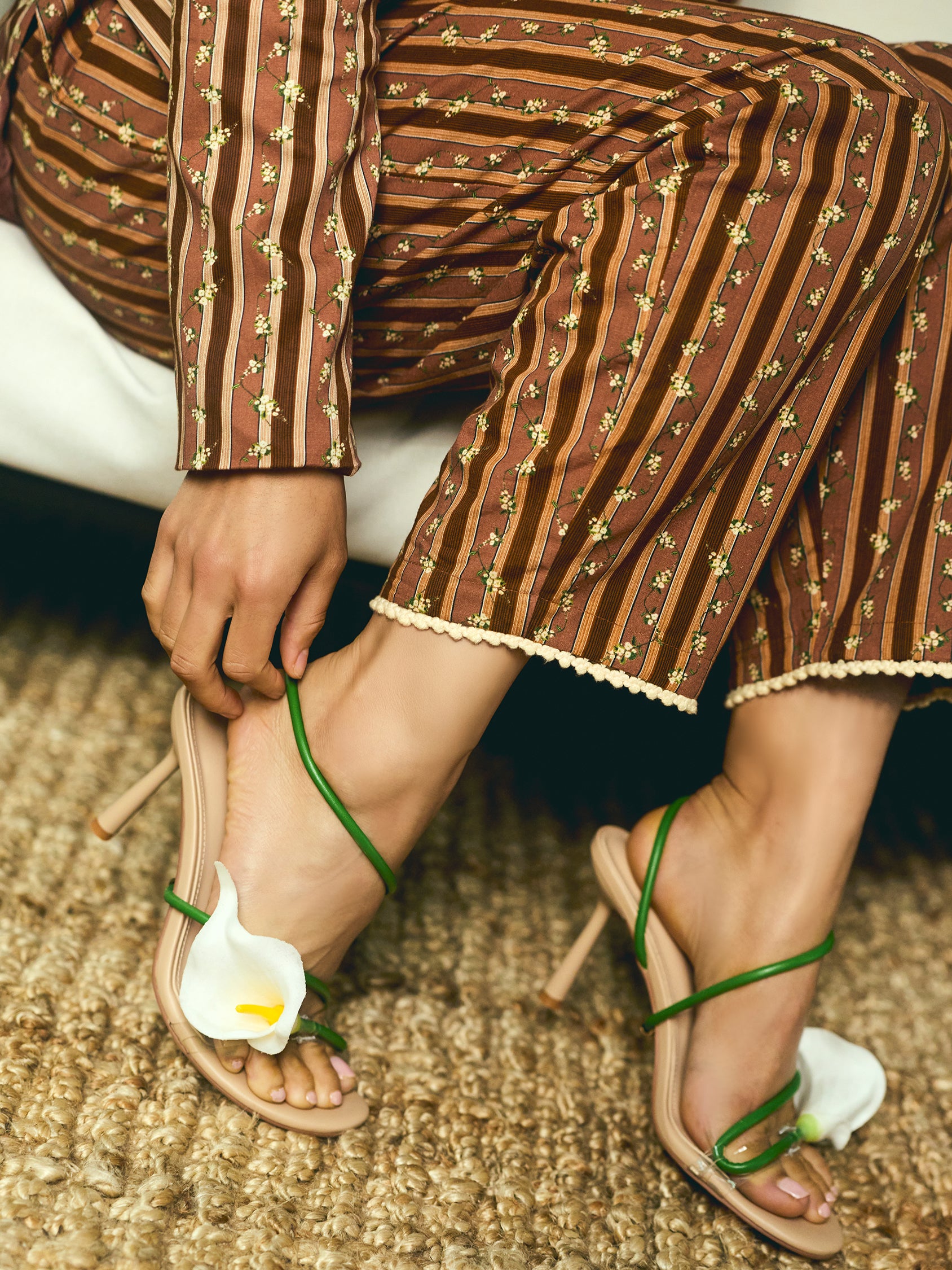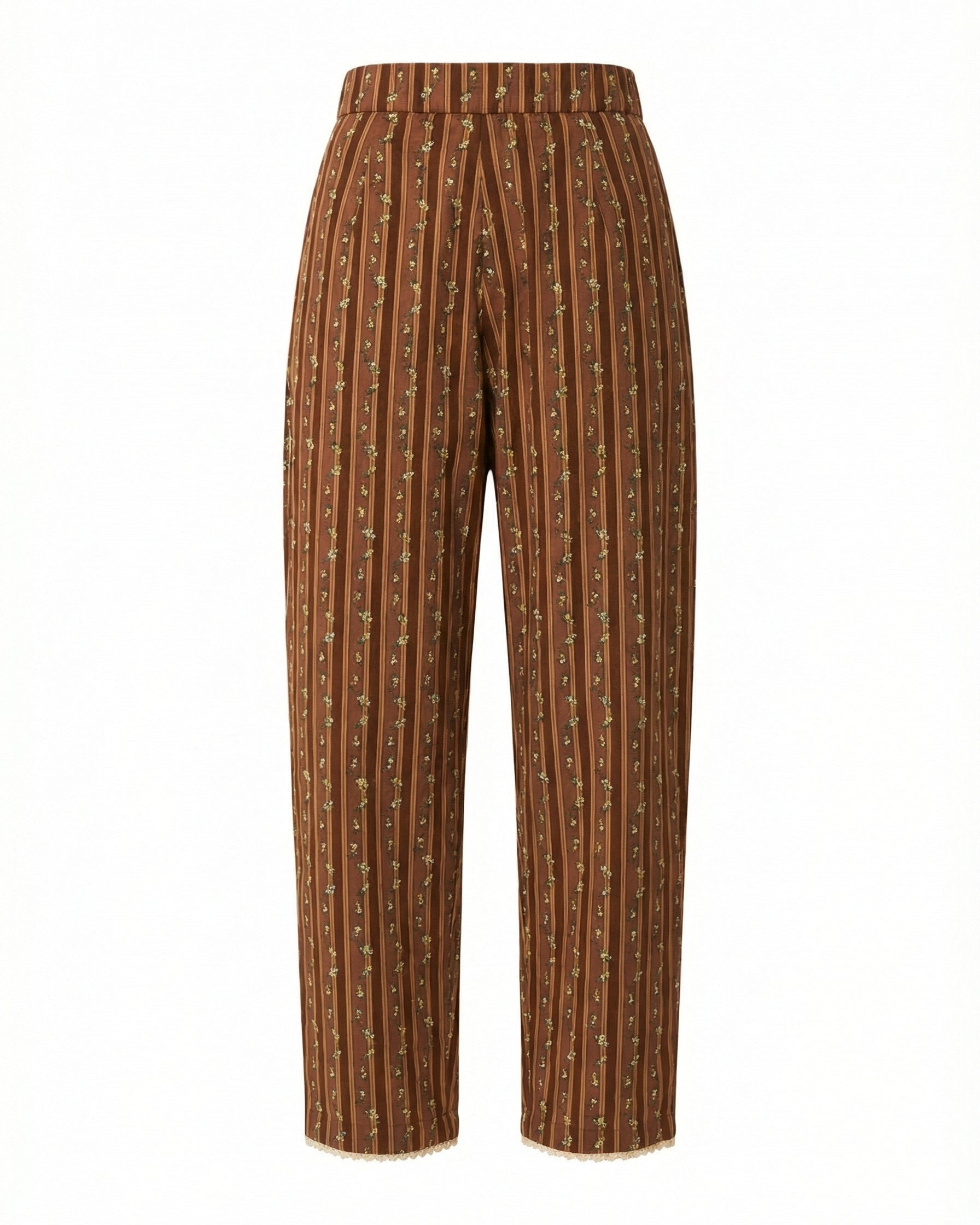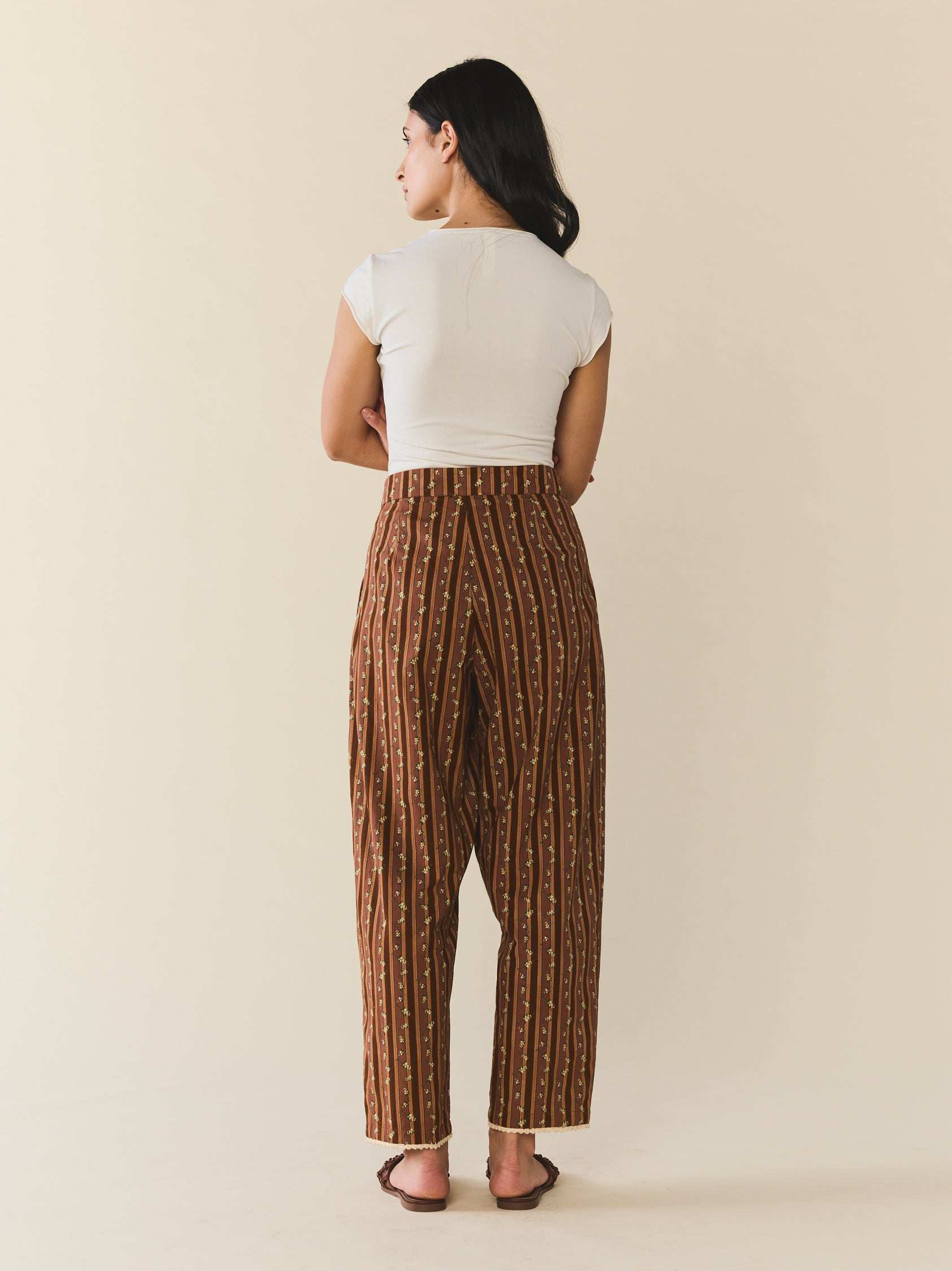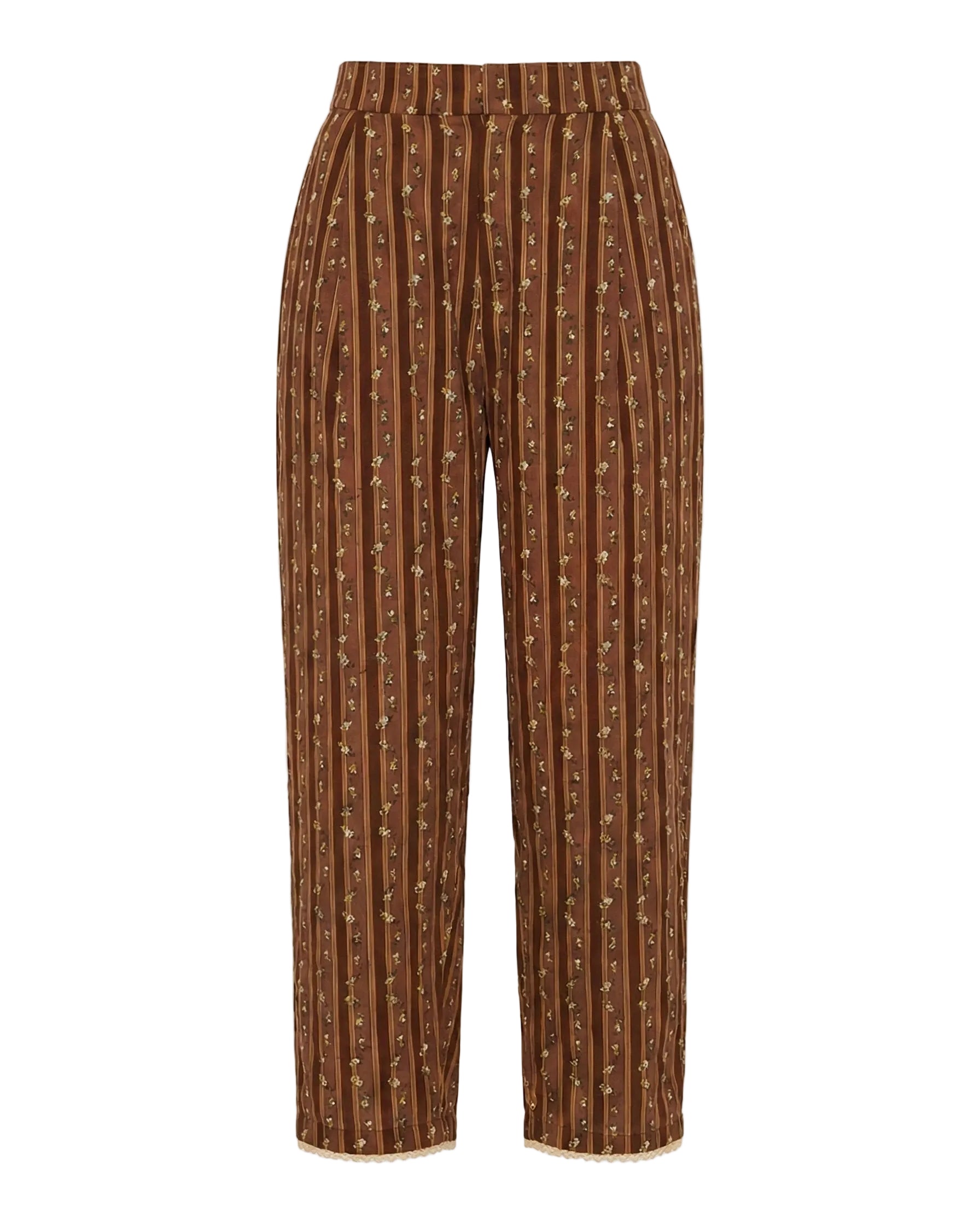 Introducing the Nina Pant, tailored trousers with a high-waist rise showcases a stunning collaboration with artist Larsen McDowell, featuring vibrant floral artwork set against classic chocolate stripes. . Featuring slanted side pocked and structured pleats. Offering adjustability with a zip fly with hook and bar closure. Finished with an wide leg, draping comfortable over your leg.