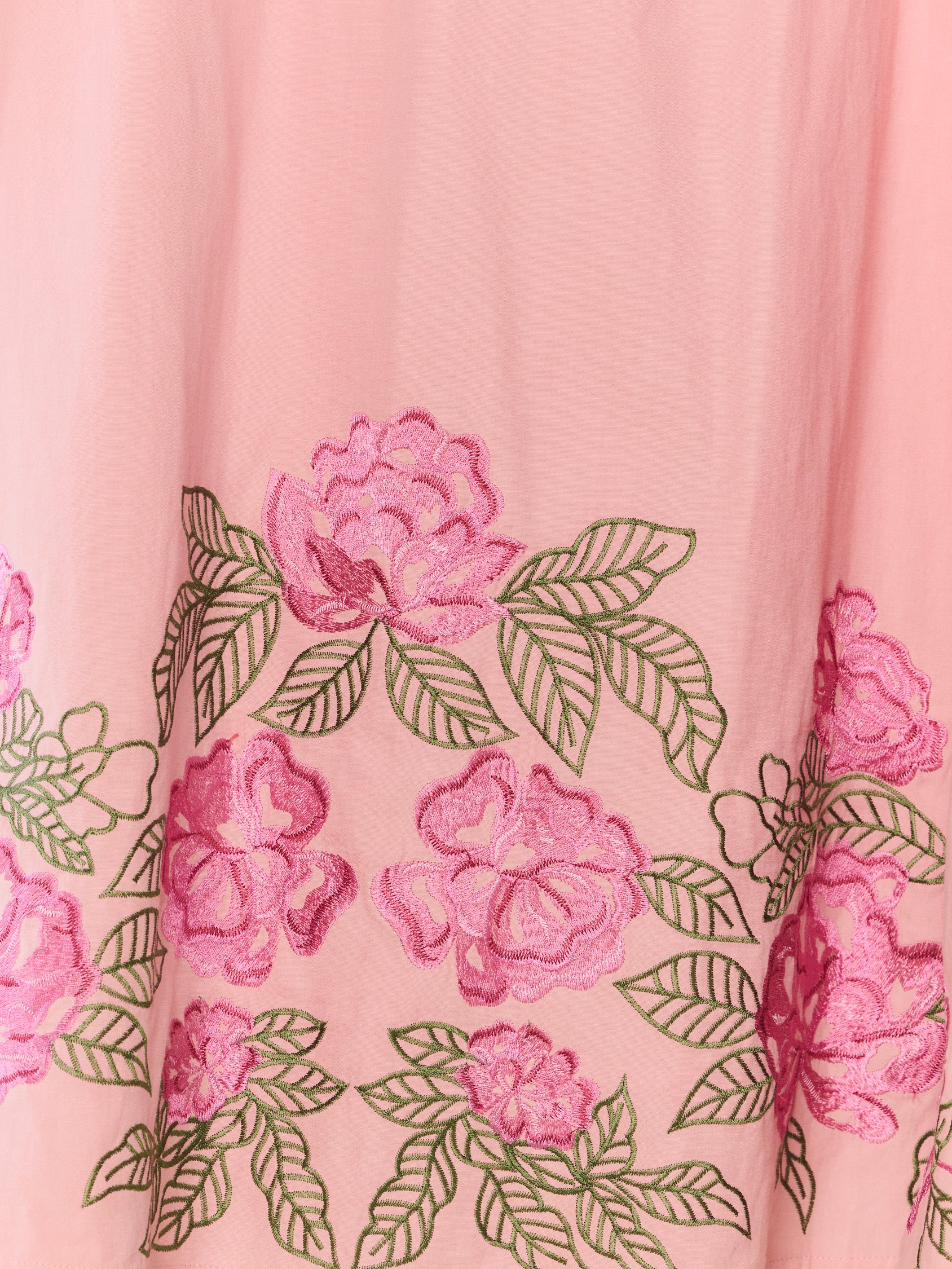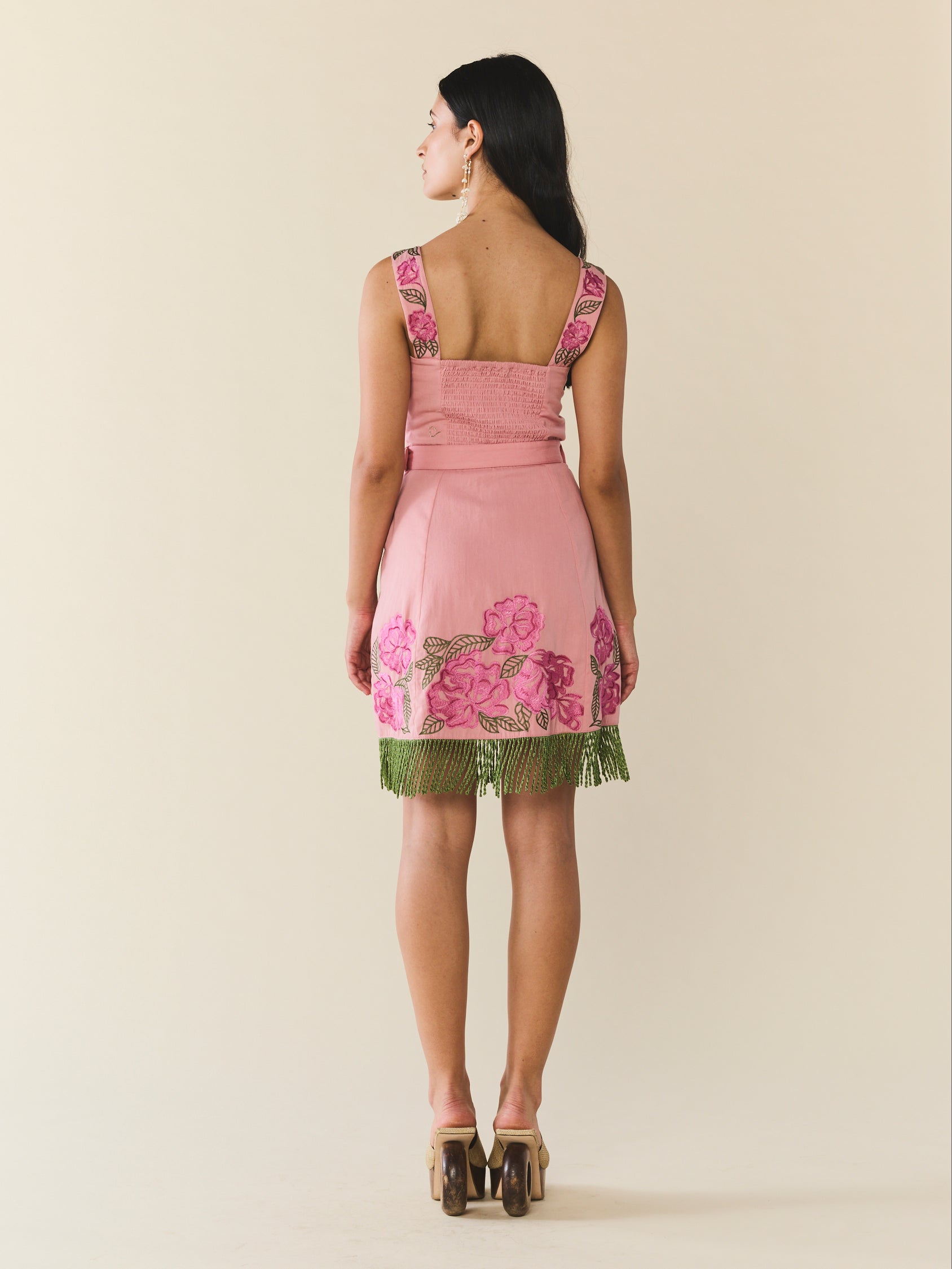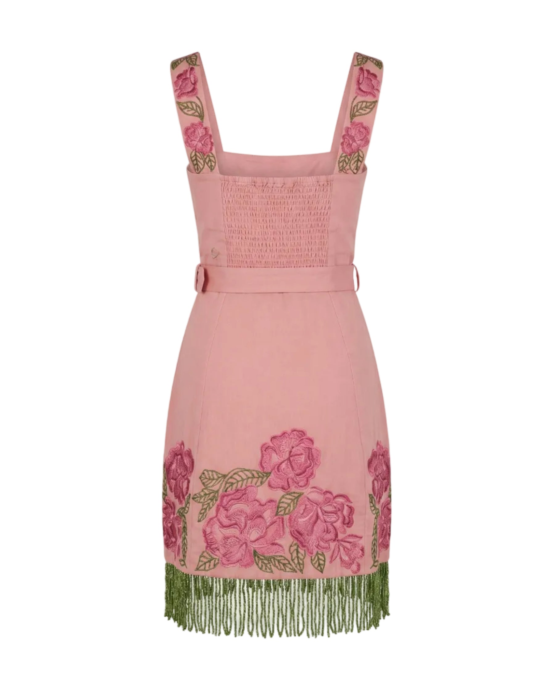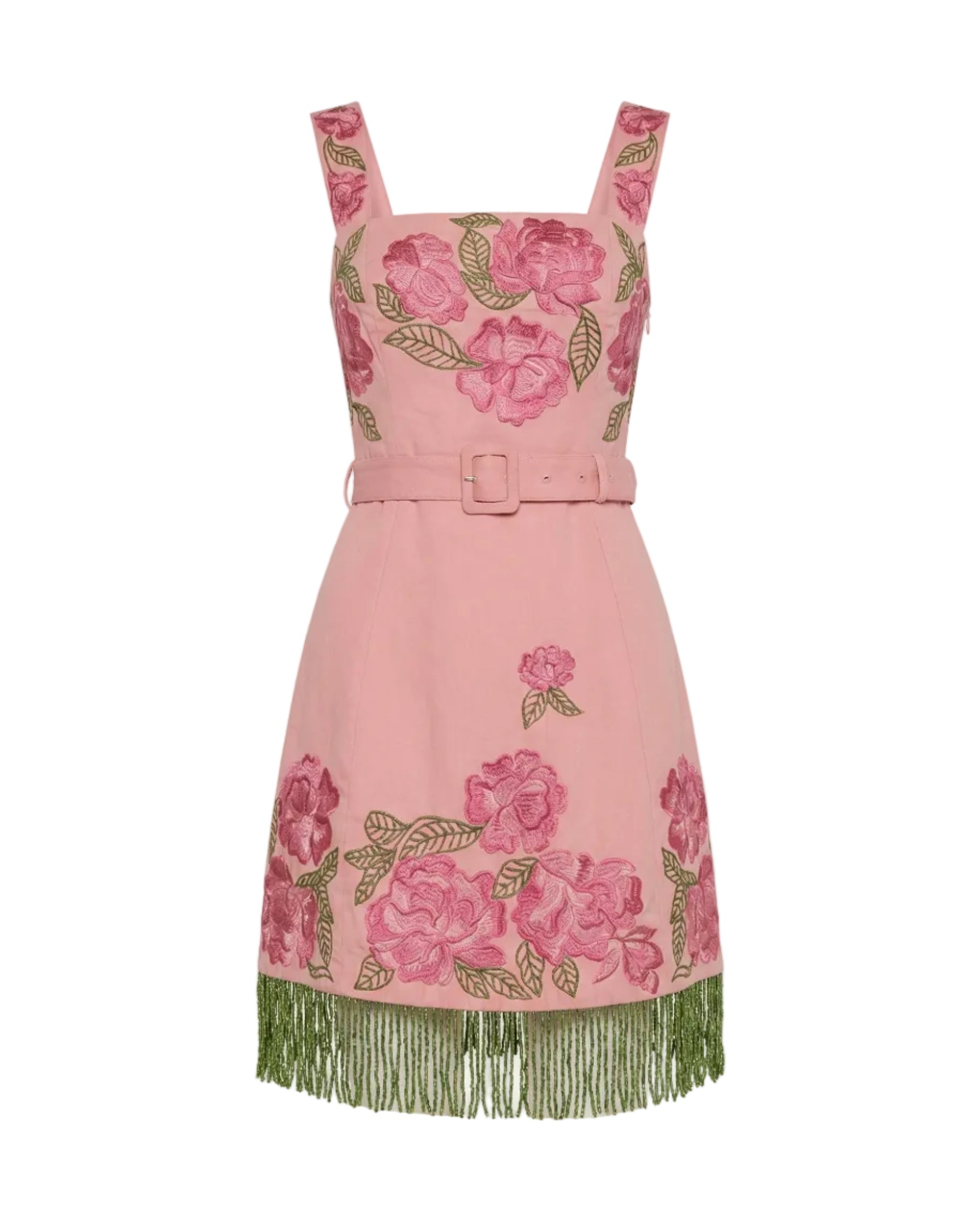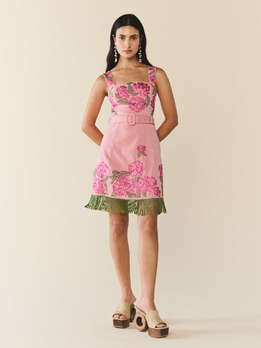 The Sarah Bird Mini Dress is a playful, feminine silhouette brought to life in our Peony Pop embroidery. Vibrant pink peonies bloom across the soft blush fabric, creating a bold floral statement that feels both romantic and joyful. The structured bodice is balanced by wide straps and a flattering square neckline, while a matching belt defines the waist. A softly flared skirt finishes with a textured fringe hem that adds movement and a touch of fun with every step.