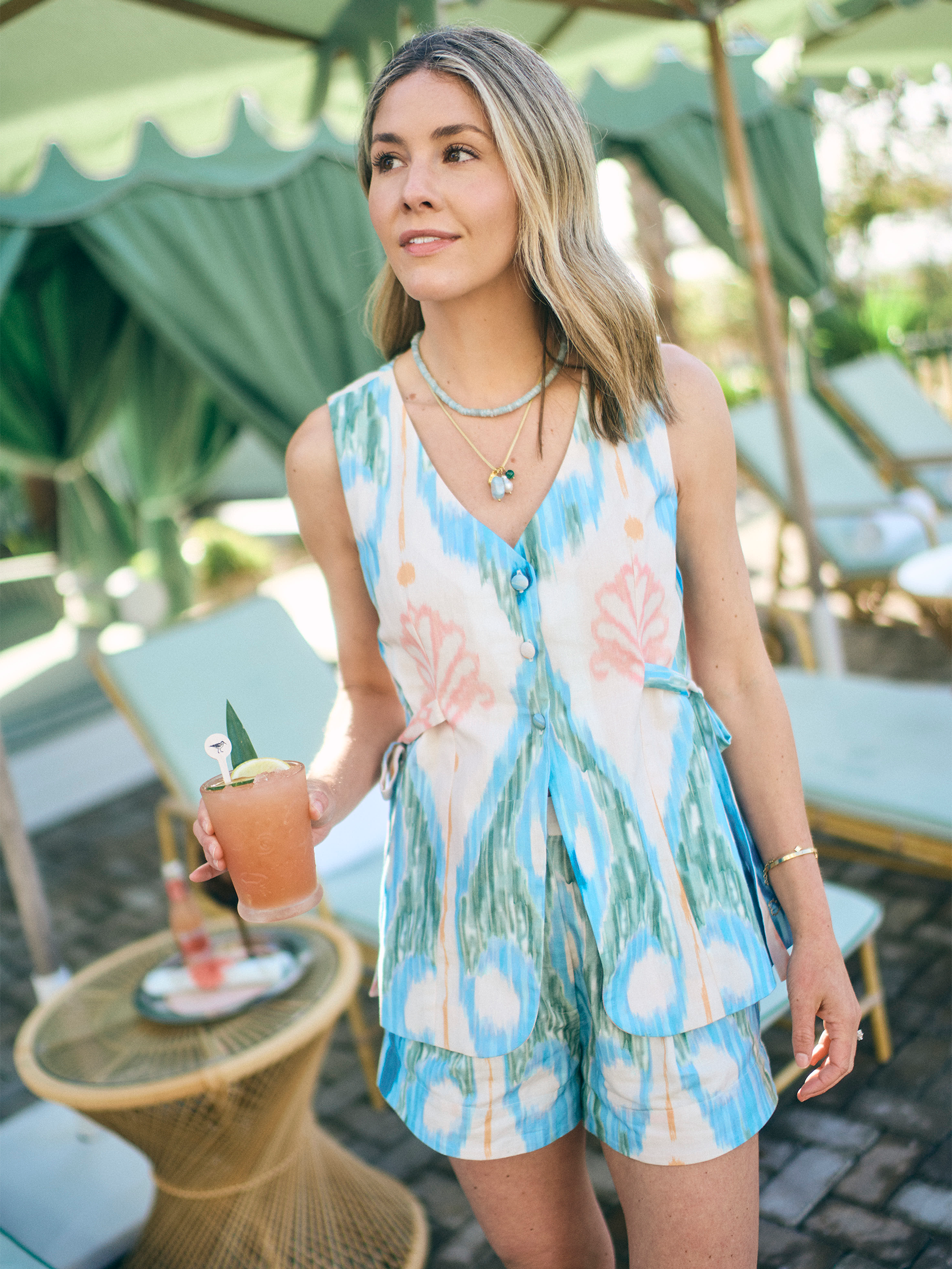 The Tasha Short comes in a watercolor-like print, blues and greens that feel like ocean light in motion. Cut in lightweight linen and cotton with soft pleats and an easy, flattering shape, they move with you from busy mornings to whatever the day turns into.