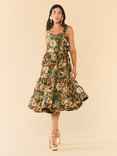 Two pieces, endless possibilities. This floral jacquard dream is made to be worn as a full look or split up for twice the styling fun. The top features corset-style back ties, a hidden side zip, and just the right amount of stretch for comfort. The matching wrap skirt ties at the waist and falls to a flattering midi length, finished with tiny pearl and silver bead embellishments along the hem, because details matter. Romantic, a little dramatic, and effortlessly cool.